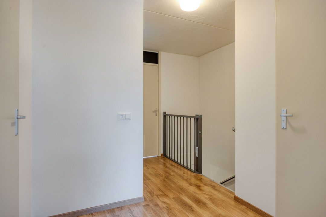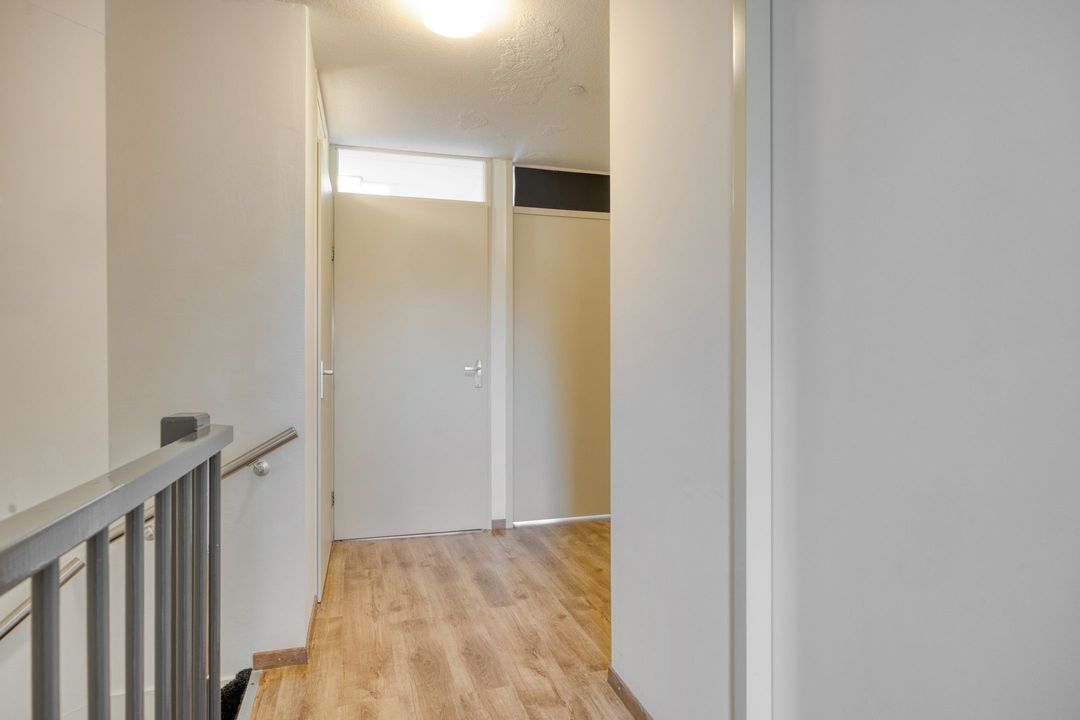 Via de vaste trap bereikt u de eerste verdieping. De overloop biedt toegang tot drie slaapkamers, een aparte wasruimte, de badkamer en een separaat toilet.