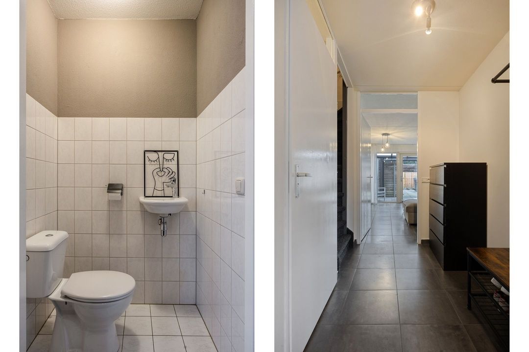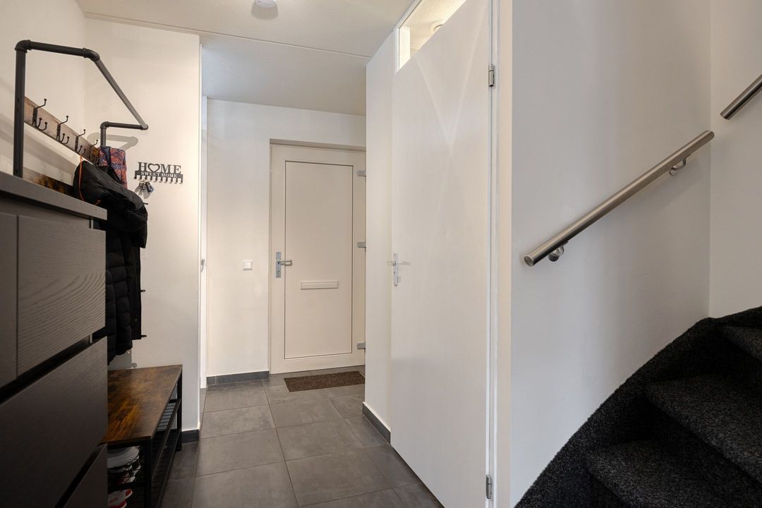 Via de ruime entree, voorzien van een nette tegelvloer, betreedt u de woning. Vanuit de hal heeft u toegang tot de meterkast, de toiletruimte, de trapopgang en de woonkamer met open keuken en eetkamer. De toiletruimte is grotendeels betegeld en uitgerust met een staand closet en fonteintje.