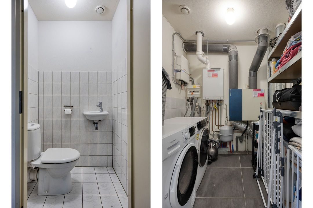• Wasruimte: Praktische aparte wasruimte van circa 4 m² met plaats voor wasmachine en droger, extra bergruimte en opstelling van de cv-ketel (Intergas, huur, 2021), WTW-installatie en omvormer voor de zonnepanelen.