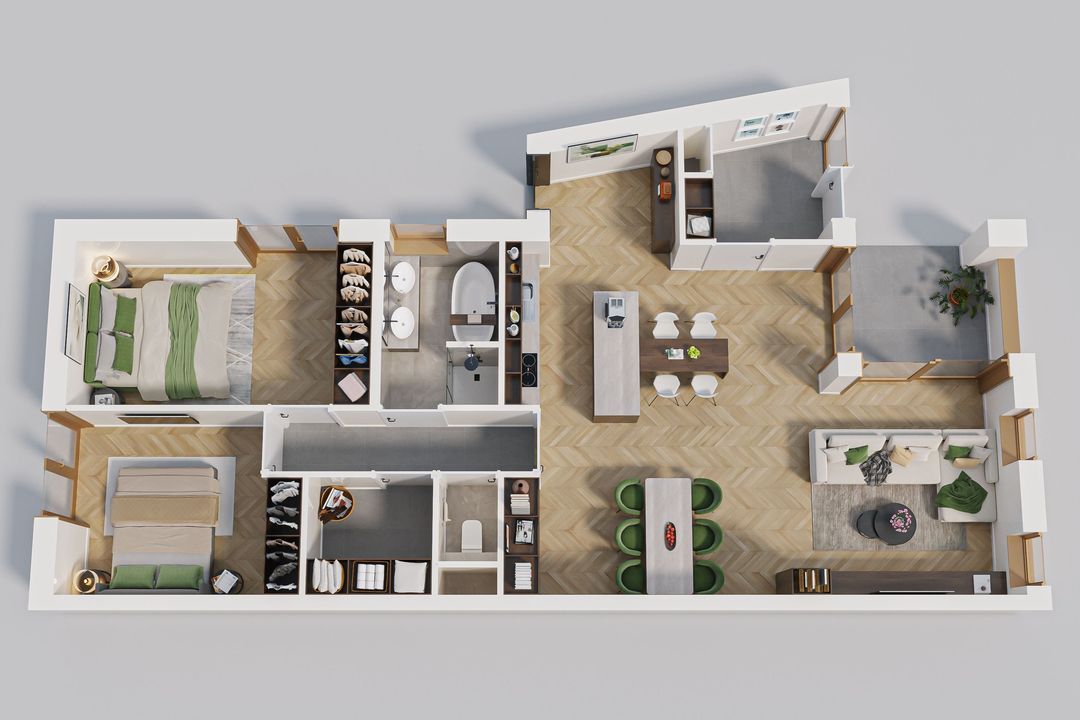 De oplevering van de appartementen is semi-casco, dat wil zeggen dat alle benodigde installaties en aansluitpunten aanwezig zijn, de plafonds zijn gespoten en wanden en vloeren zijn klaar voor afwerking. We laten aan de koper de keuze in de kwaliteit en comfort in afwerking en inrichting van de keuken, sanitair en badkamer. Interieurstyliste Ineke Roosen helpt u graag uw uiteindelijke keuzes te bepalen.