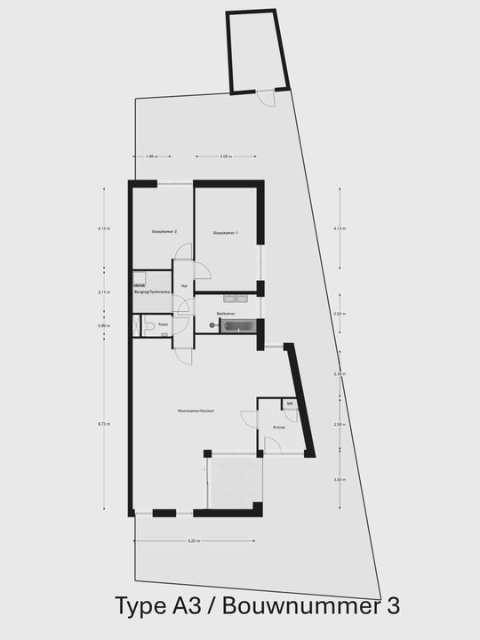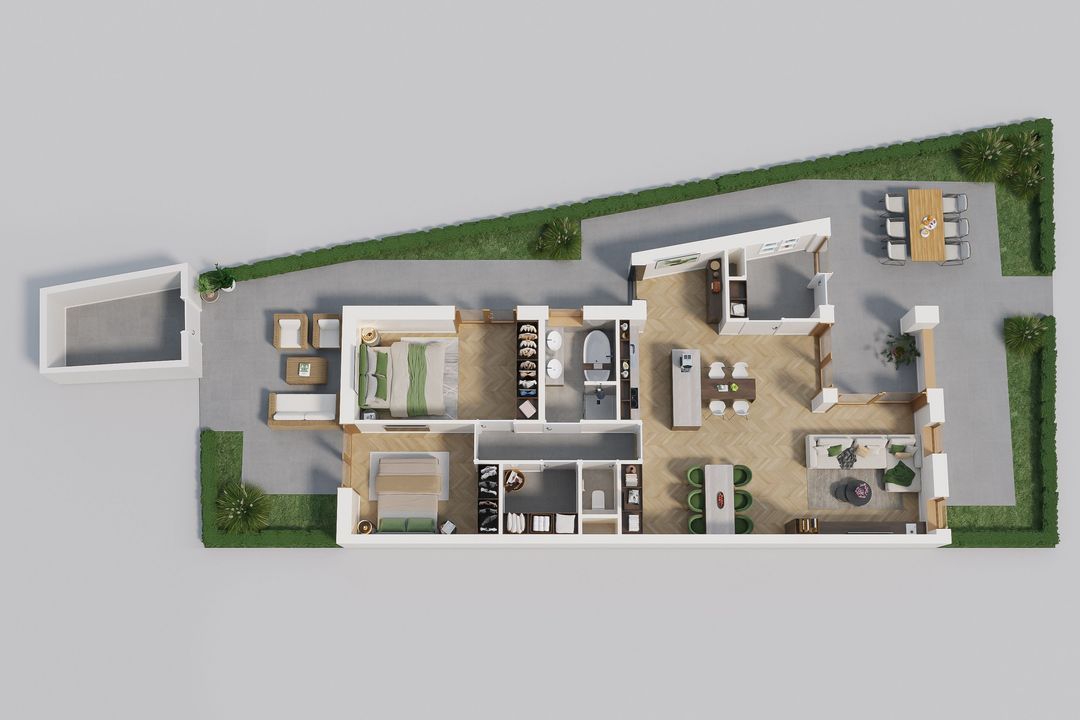 WONINGTYPE A3: Dit hoekappartement met een gebruiksoppervlakte van ruim 104 m² is gelegen op de begane grond, heeft een eigen toegangsdeur aan de buitenzijde en heeft een tuin rondom met een overdekt terras op het zuidwesten van waar u zicht heeft op de Kapelkesstraat. Het appartement beschikt over twee slaapkamers, badkamer, toilet en een berging/technische ruimte. Een eigen buitenberging is inbegrepen.