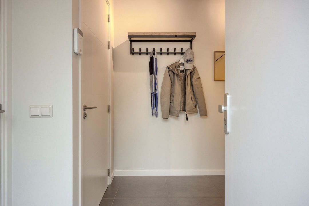 Via de entree betreedt u de hal, welke is afgewerkt met een stijlvolle antracietkleurige tegelvloer. Vanuit de hal heeft u toegang tot de moderne toiletruimte, de meterkast, de woonkamer met open keuken en de trapopgang naar de eerste verdieping. De toiletruimte is volledig betegeld en voorzien van een zwevend toilet en een fonteintje. De gehele begane grond is uitgerust met comfortabele vloerverwarming, wat bijdraagt aan een aangenaam wooncomfort.