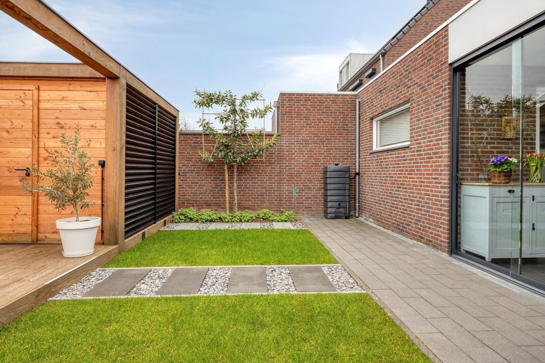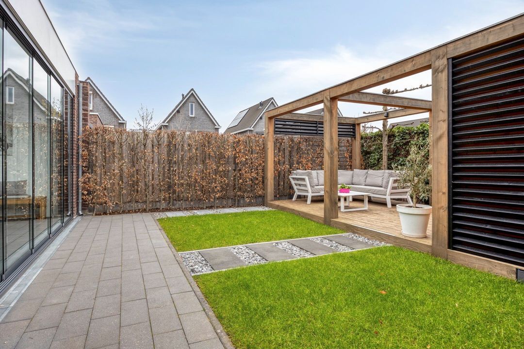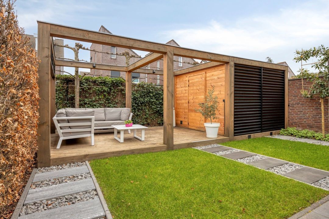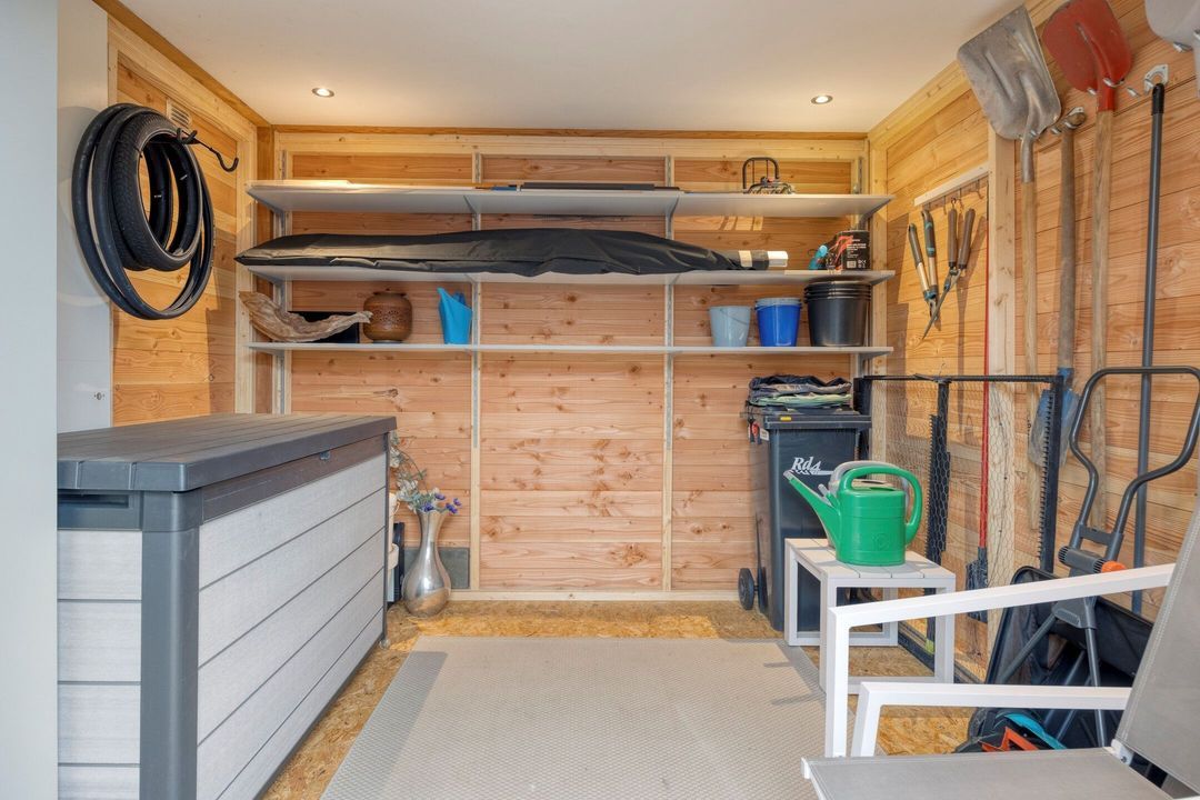 Achter in de tuin bevindt zich een stijlvolle veranda met een hoogwaardige vlondervloer en sfeervolle verlichting, een ideale plek om in alle rust te zitten. Tevens hebben de huidige eigenaren een degelijk tuinhuis van Douglashout (ca. 10 m²) geplaatst. Dit tuinhuis is voorzien van elektra, krachtstroom en praktische legplanken, waardoor het perfect geschikt is voor het opbergen van tuinmaterialen en gereedschap.