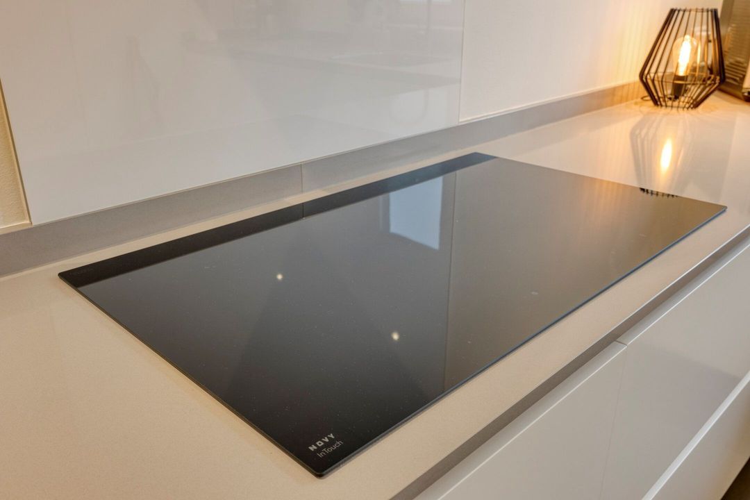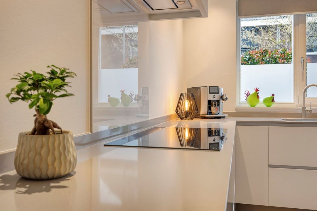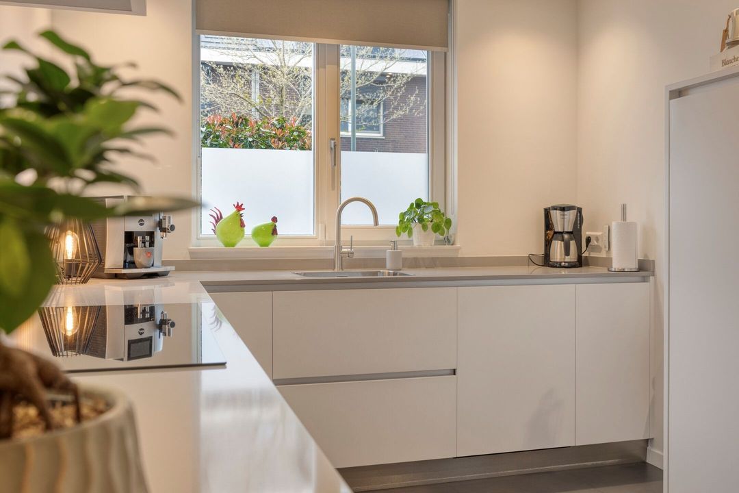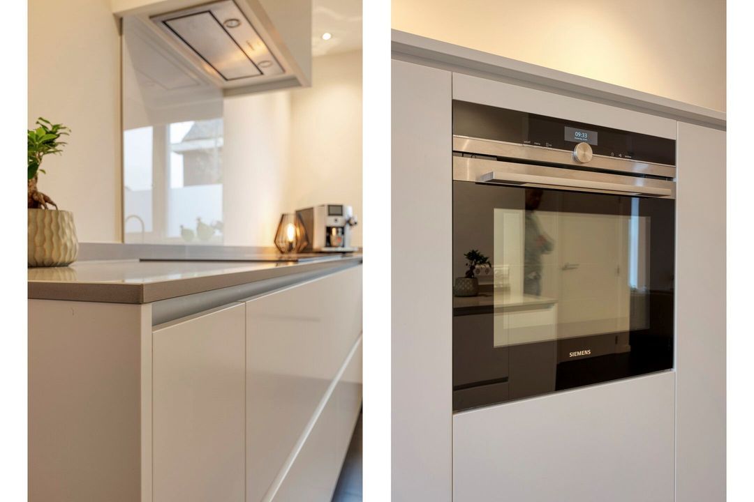 De moderne, witte keuken is aan de voorzijde van de woning gelegen en uitgevoerd in een L-opstelling. Deze maatwerk keuken heeft een strak, greep loos design en is voorzien van hoogwaardige inbouwapparatuur, waaronder een inductiekookplaat van 'Novy', afzuigkap, combi-oven, koelkast en vaatwasser (overige apparatuur van Siemens). De doorlopende tegelvloer vanuit de hal versterkt het gevoel van rust en eenheid op de begane grond.