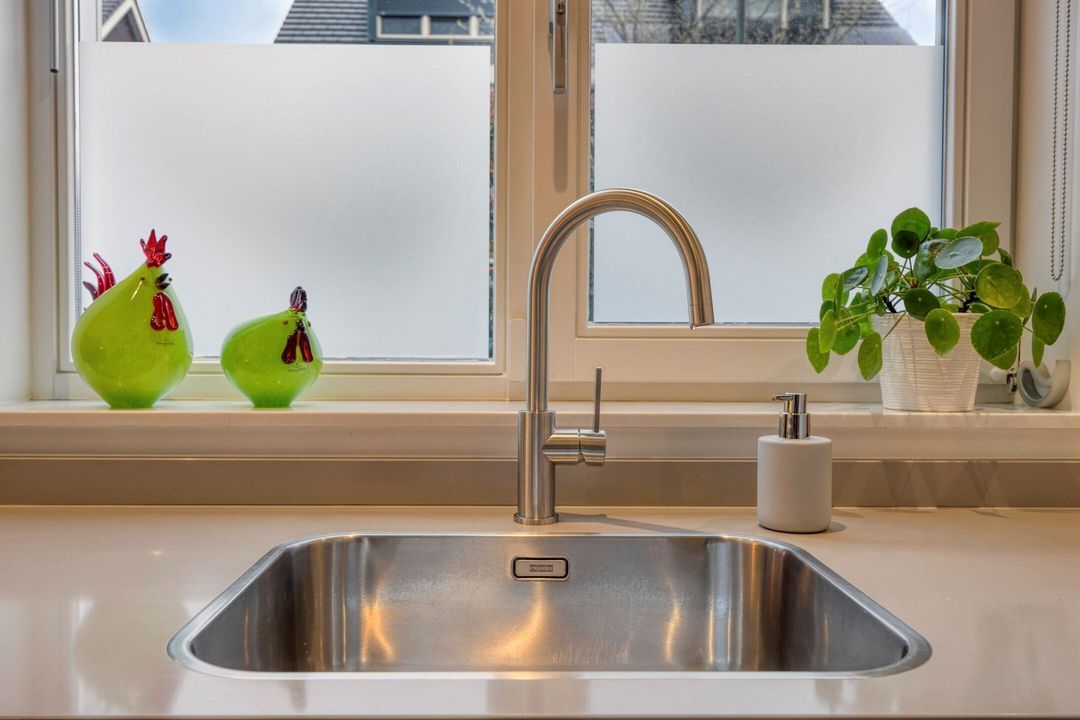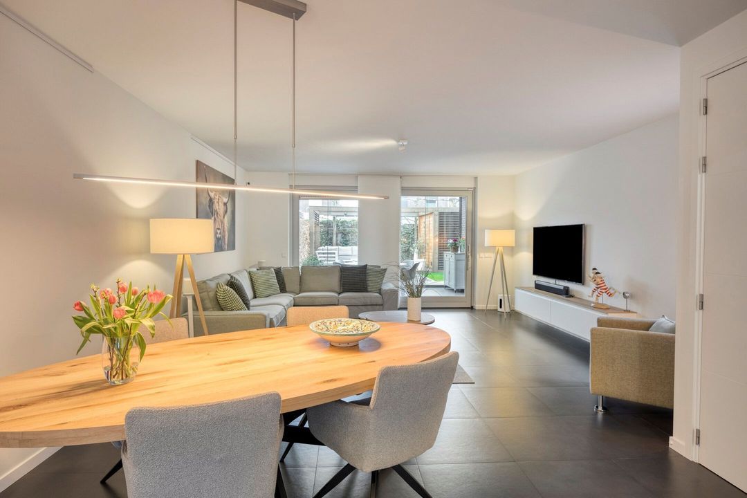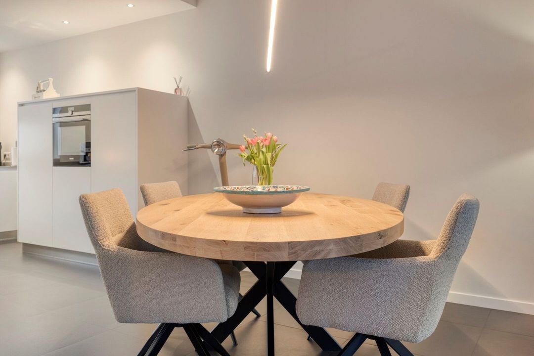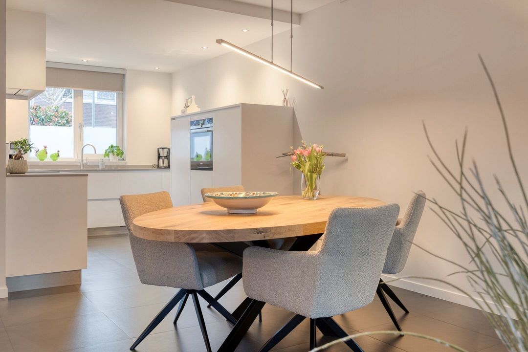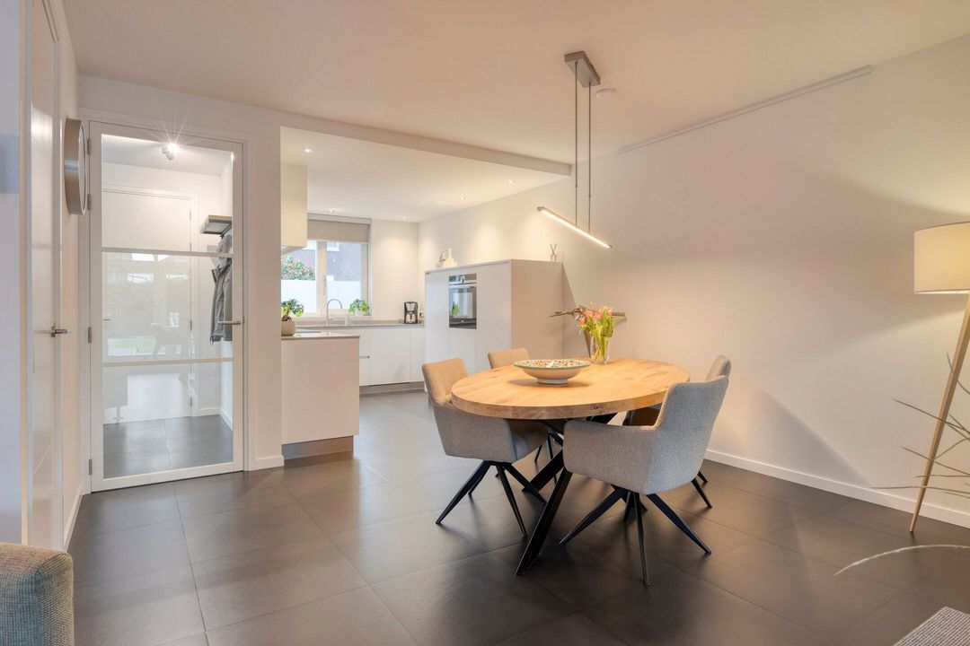 De moderne, witte keuken is aan de voorzijde van de woning gelegen en uitgevoerd in een L-opstelling. Deze maatwerk keuken heeft een strak, greep loos design en is voorzien van hoogwaardige inbouwapparatuur, waaronder een inductiekookplaat van 'Novy', afzuigkap, combi-oven, koelkast en vaatwasser (overige apparatuur van Siemens). De doorlopende tegelvloer vanuit de hal versterkt het gevoel van rust en eenheid op de begane grond.