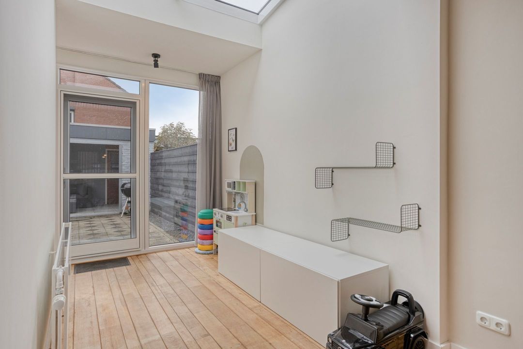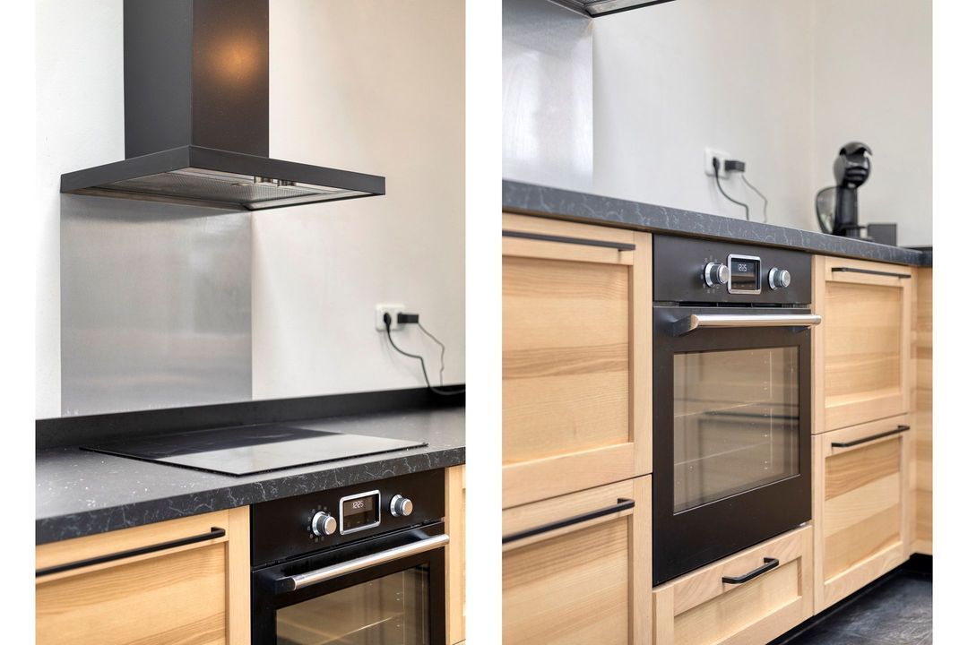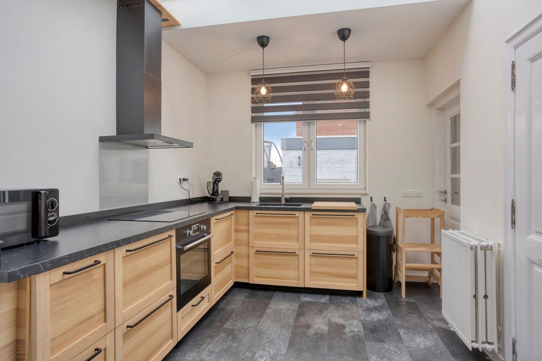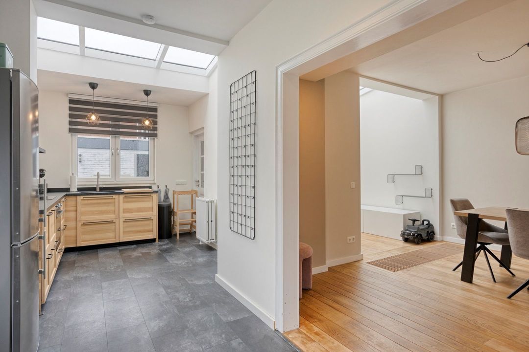 De door de verkopers vernieuwde keuken van ca. 17 m² is een licht en sfeervol vertrek dankzij de grote lichtstraat. De L-vormige opstelling is voorzien van een inductiekookplaat, afzuigkap, combi-oven en koelkast. Vanuit de keuken is er een directe doorloop naar de woonkamer en een aparte deur naar de achterzijde van het huis, evenals toegang tot de kelder.