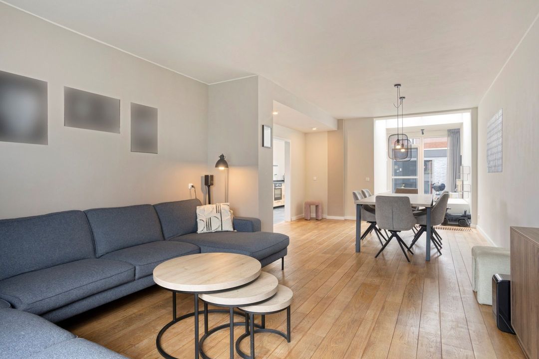De woonkamer met een gedeelte van de uitbouw is ca. 40 m² is een lichte en uitnodigende leefruimte met een massief houten vloer. Grote raampartijen, een hoge deur en de lichtstraten zorgen voor veel daglicht. laten het daglicht rijkelijk binnenstromen en bieden direct zicht en toegang tot de tuin. Hier is tevens de praktische extra ruimte in de uitbouw. Bijvoorbeeld als extra ruimte voor een kast of als speelhoek voor de kinderen.
