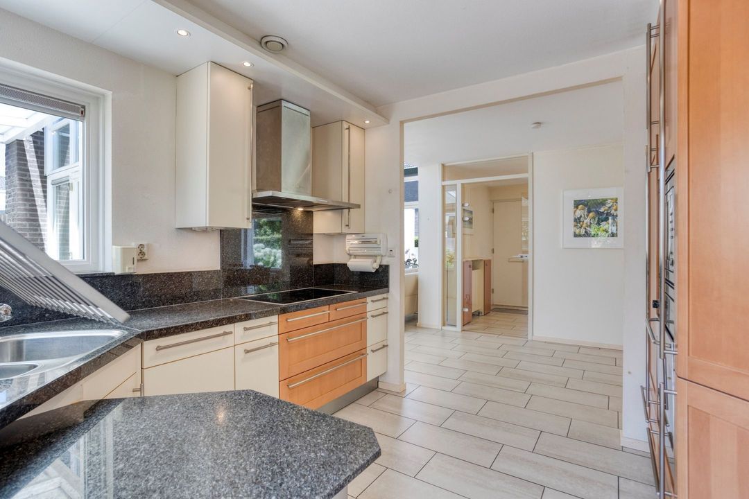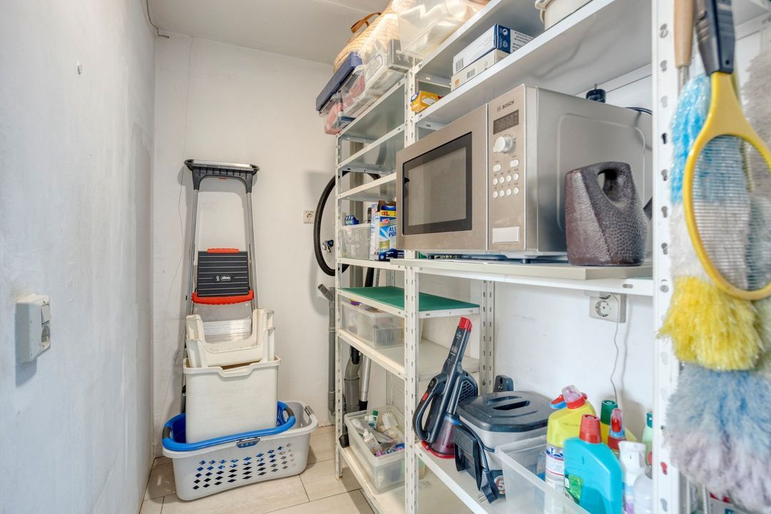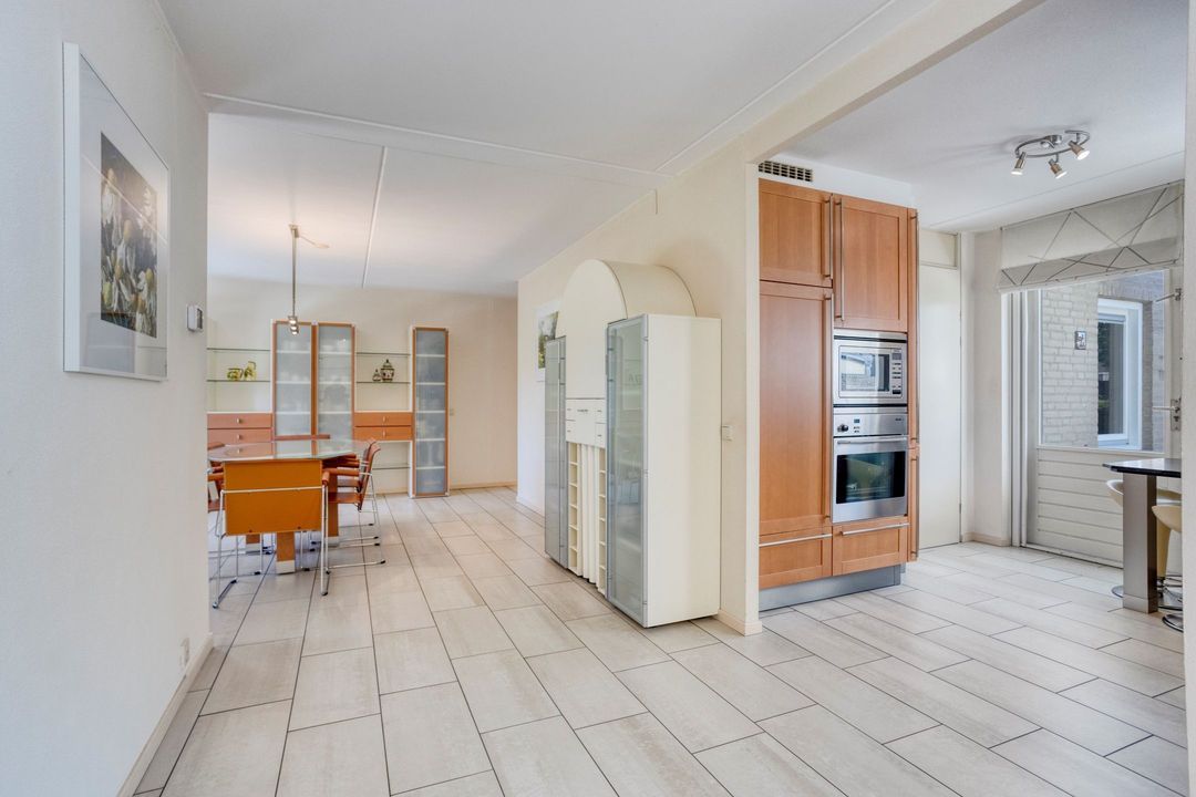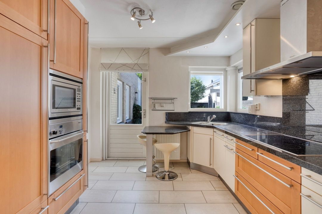 Grenzend aan de woonkamer ligt de halfopen keuken (ca. 8 m²), netjes onderhouden en voorzien van diverse inbouwapparatuur: keramische kookplaat, afzuigkap, combi-oven, magnetron, koelkast, vaatwasser en voldoende bergruimte. Aangrenzend bevindt zich de praktische berging (ca. 4 m²) met witgoedaansluiting en de cv-installatie (Intergas, huur, 2024).