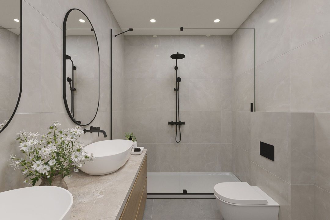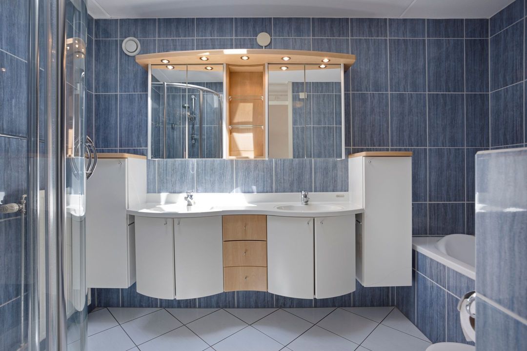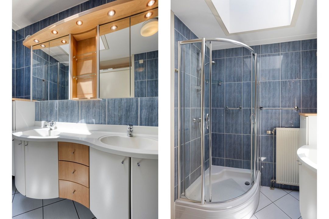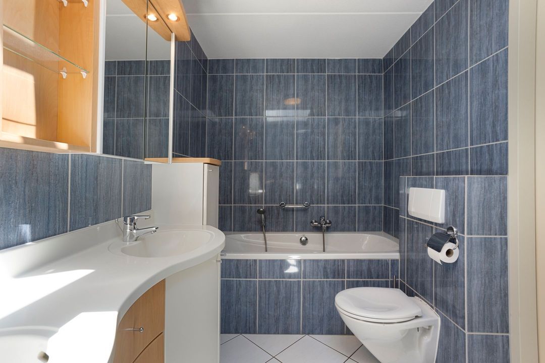 • Badkamer: De betegelde en nette badkamer is ca. 6 m² groot en voorzien van een douchecabine, een ligbad, een wastafelmeubel met dubbele wastafel en een hangcloset.