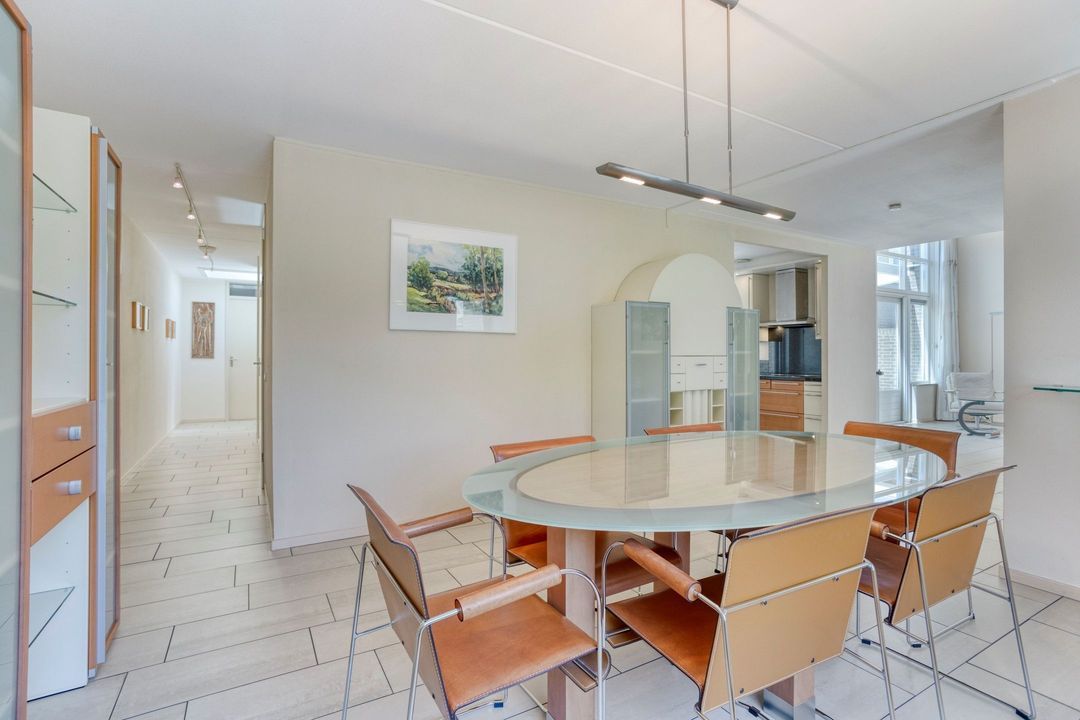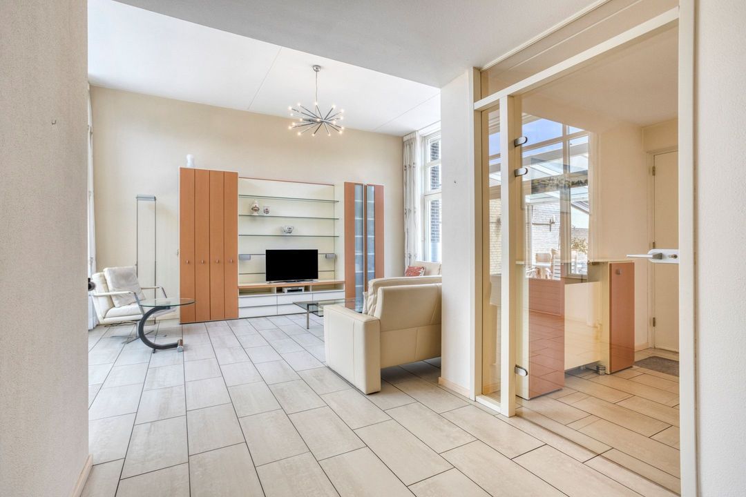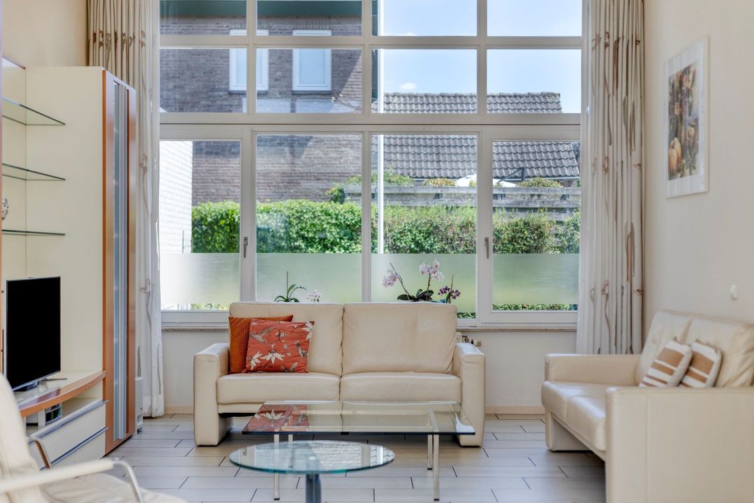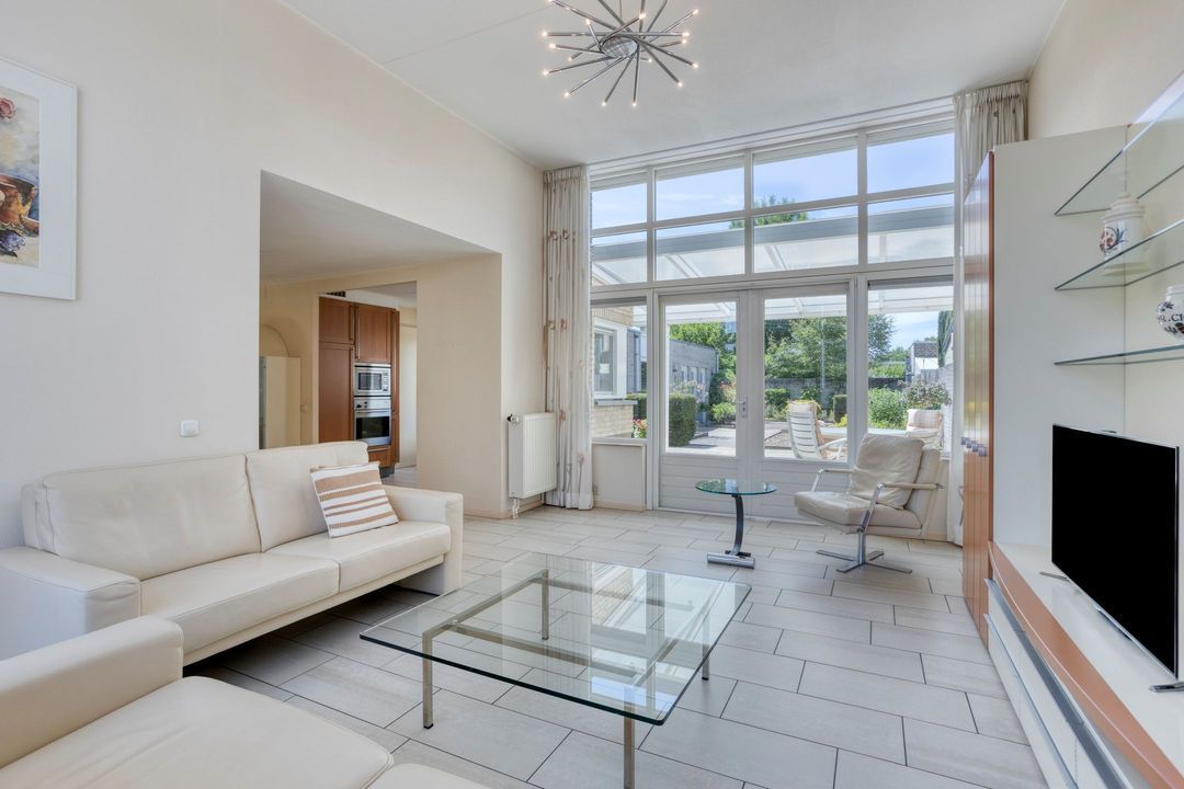 De royale woonkamer (ca. 47,5 m²) is een aangename, lichte leefruimte met hoge ramen en direct contact met de sfeervolle patiotuin. De tegelvloer uit de hal loopt hier naadloos door, wat zorgt voor rust en eenheid in het interieur.