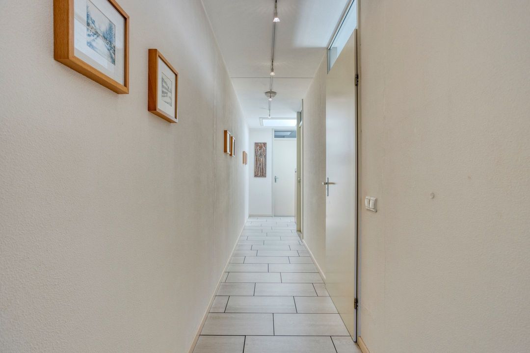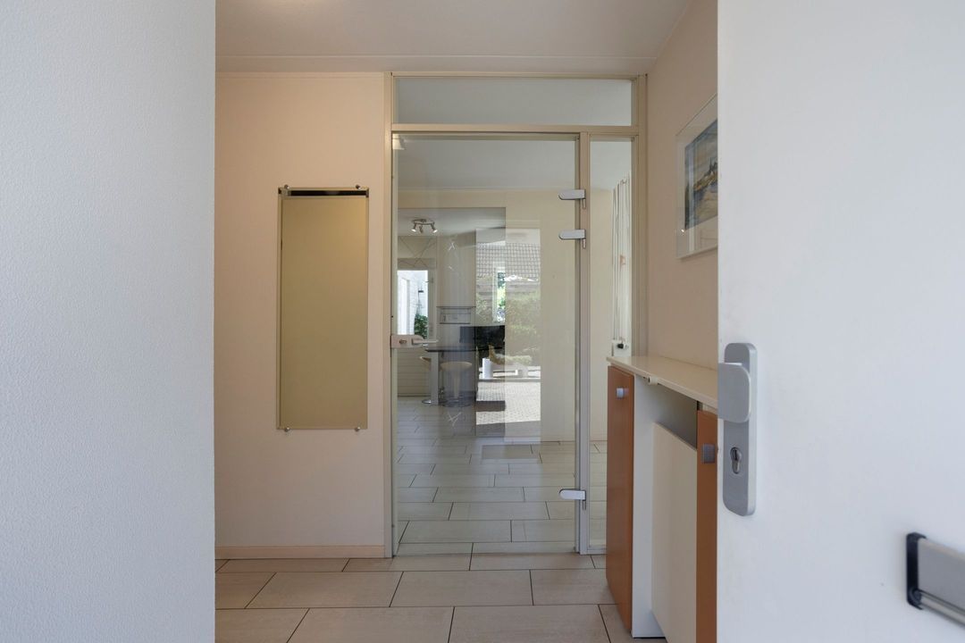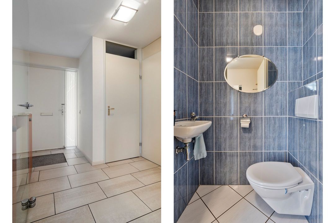 U betreedt de woning via de hal, waar de lichtgekleurde tegelvloer direct een frisse, ruimtelijke indruk geeft. Hier bevinden zich de meterkast, een modern gastentoilet met fonteintje, en de doorgang naar de woonkamer.