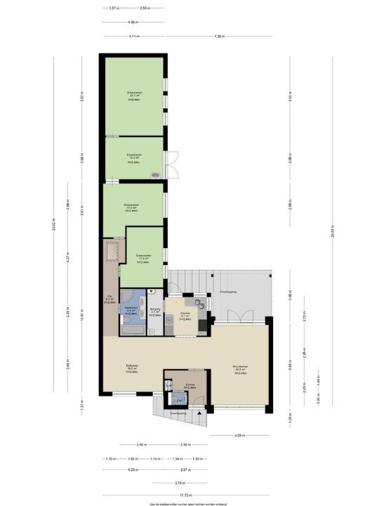 Een tweede hal (ca. 8 m²) geeft toegang tot drie slaapkamers en de badkamer: