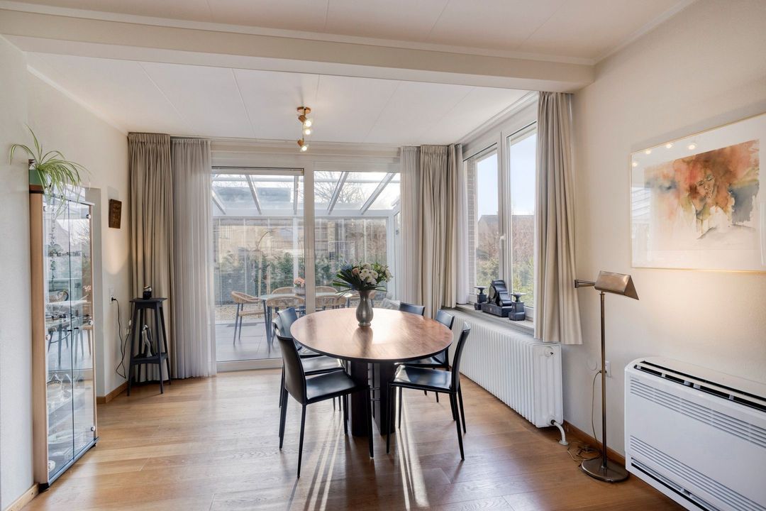 De royale woon- en eetkamer heeft een oppervlakte van circa 40 m² en is afgewerkt met een sfeervolle eikenvloer. De centraal geplaatste haard vormt een echte blikvanger en draagt bij aan de warme en gezellige ambiance. Dankzij de vele raampartijen en de grote schuifpui geniet deze ruimte van een fraaie natuurlijke lichtinval en een directe verbinding met de serre. Tevens is de woonkamer voorzien van comfortabele airconditioning.