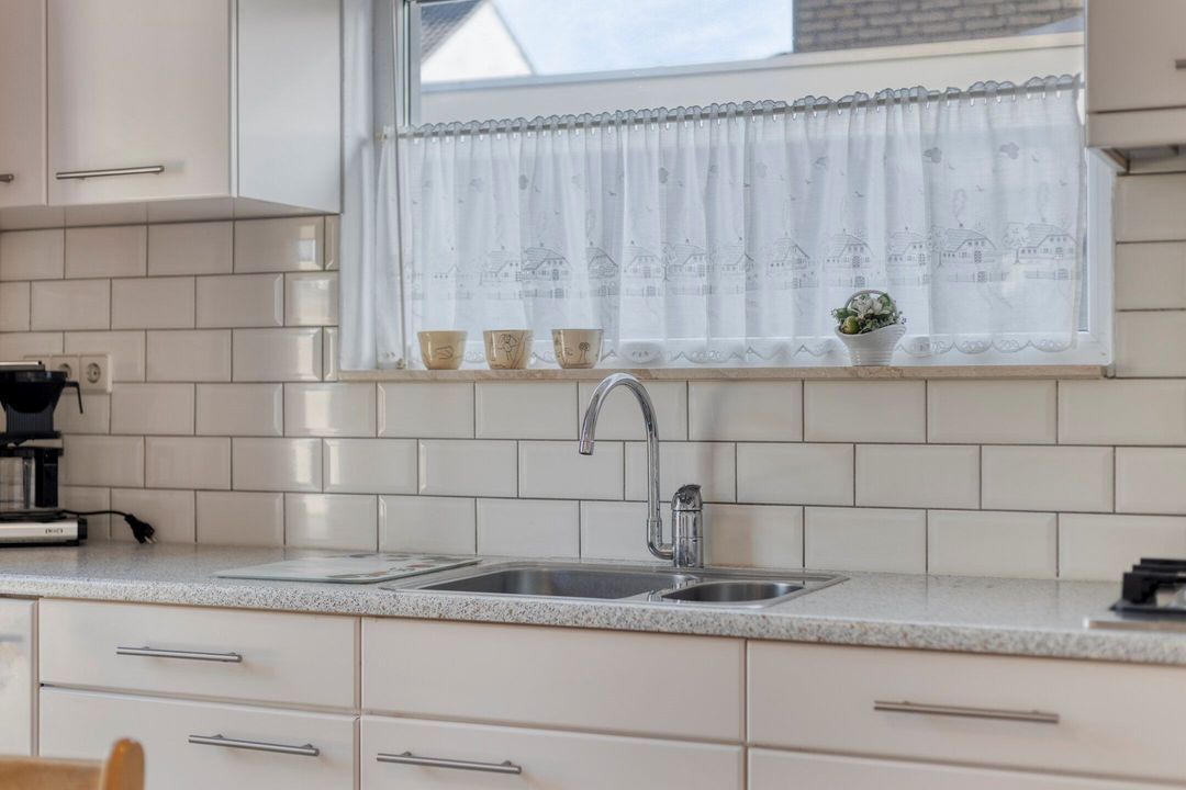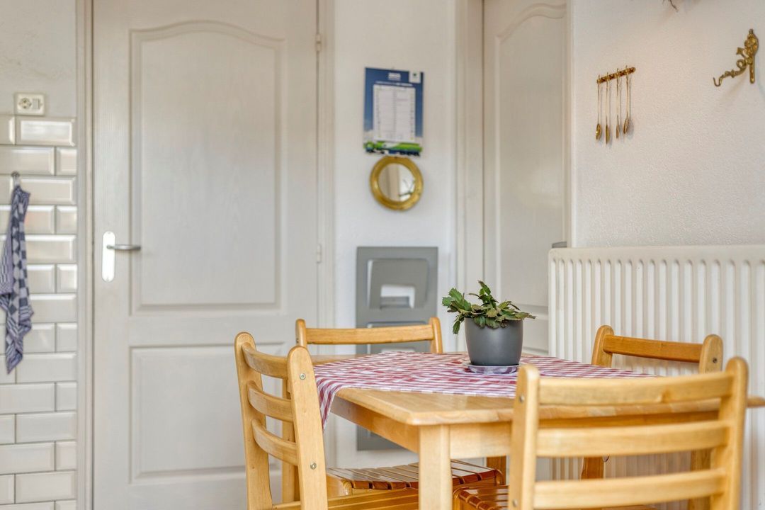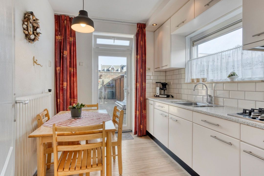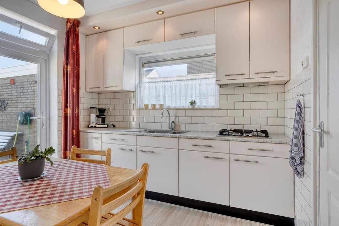 Aansluitend ligt de keuken, voorzien van een tegelvloer en een praktische indeling met voldoende werk- en bergruimte. De keuken is uitgerust met een 4-pits gasfornuis en afzuigkap en beschikt over een deur naar de achtertuin, waardoor ook hier het buitenleven eenvoudig betrokken wordt bij het dagelijks wonen.