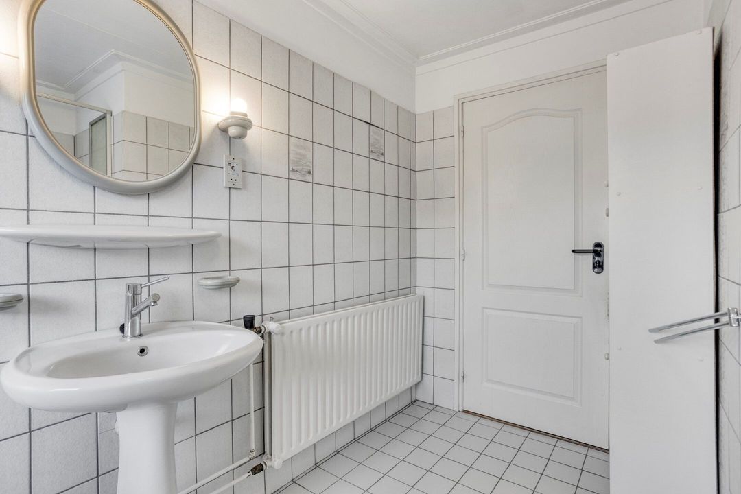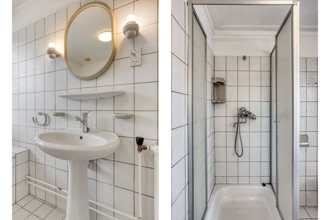 • Badkamer: De ruime, goed onderhouden badkamer is betegeld en ca. 7 m² groot. De badkamer is voorzien van een douchcabine, een ligbad, een wastafel en een staand closet.