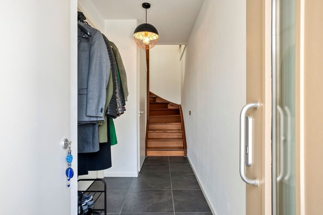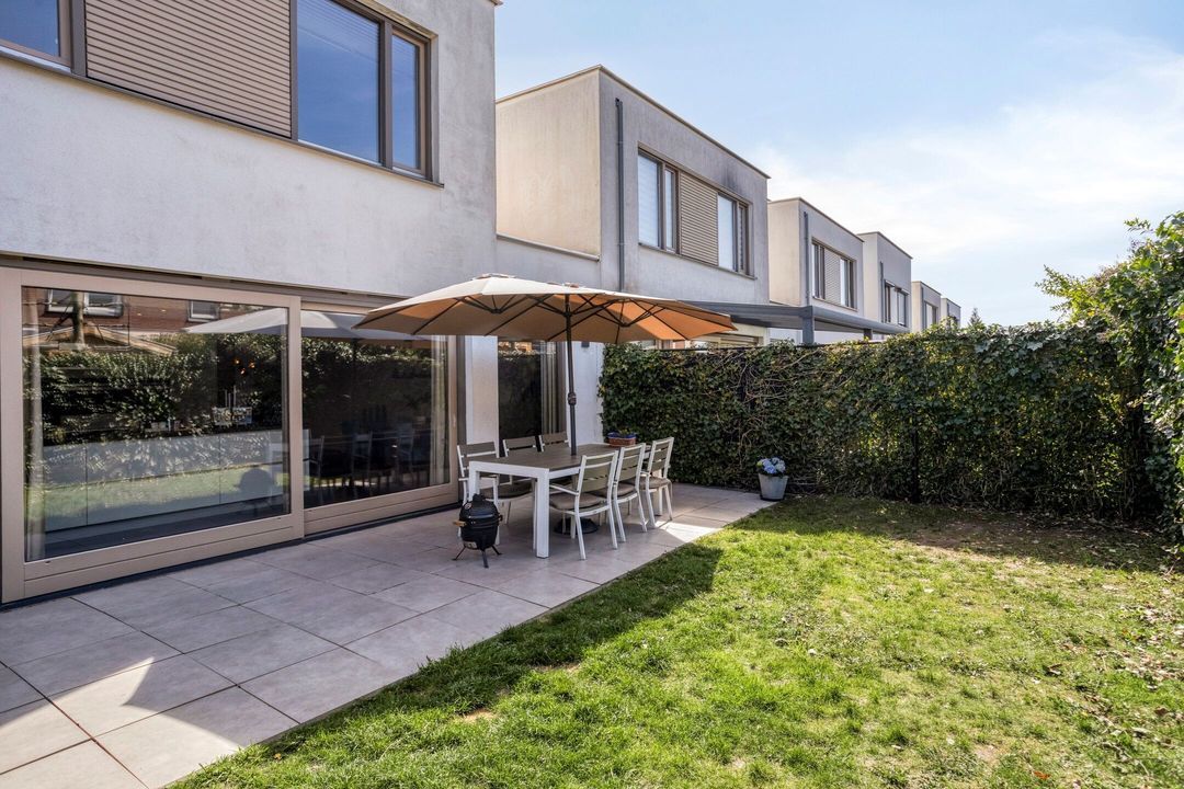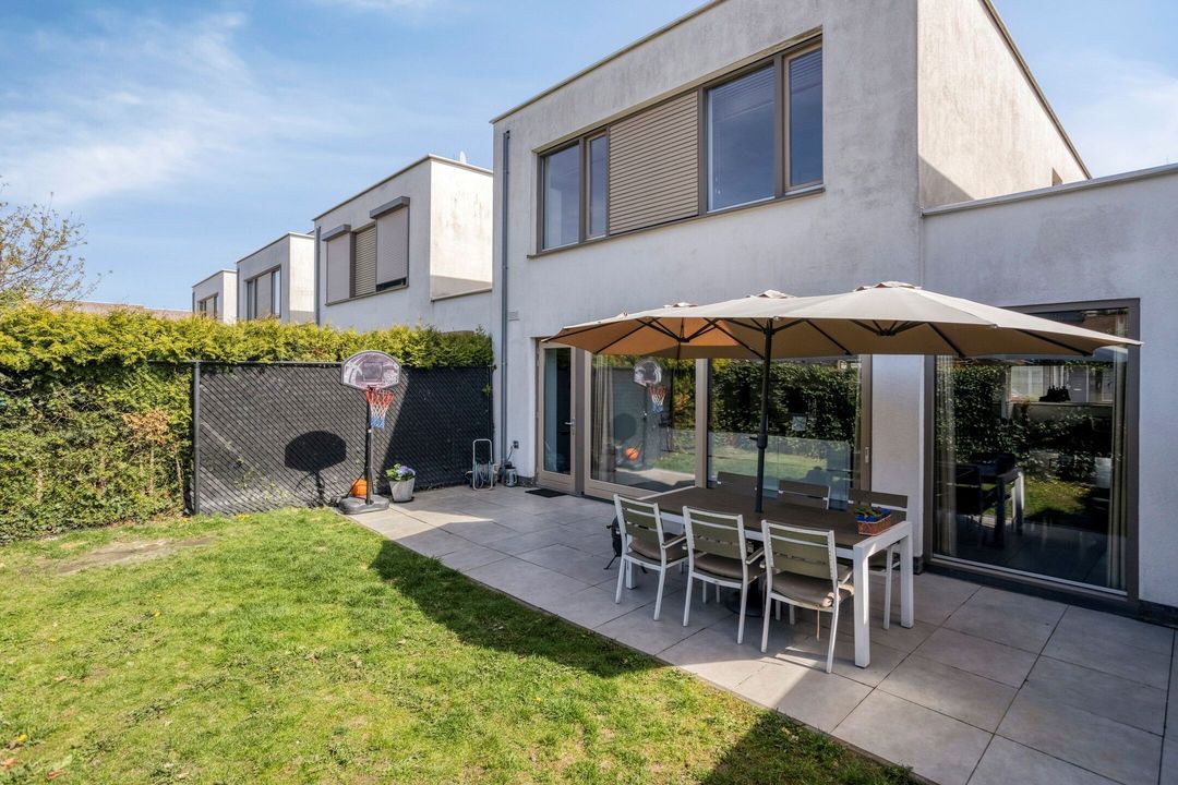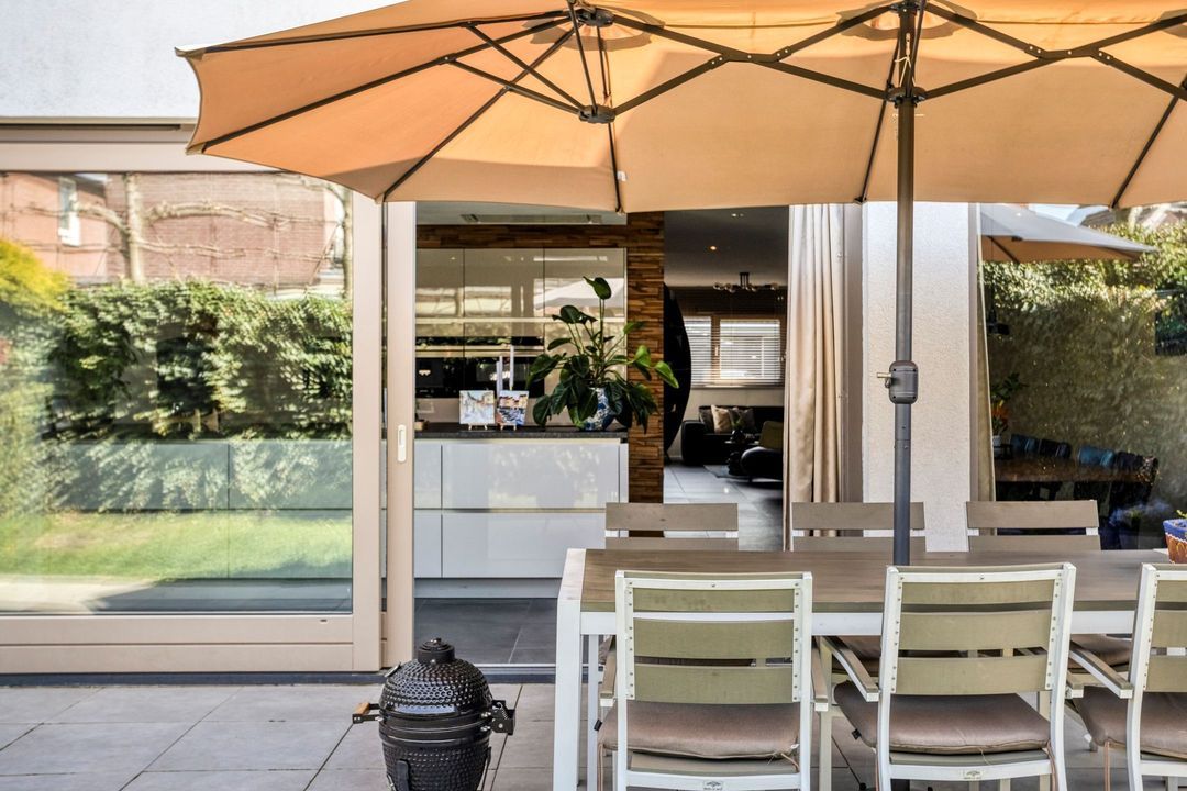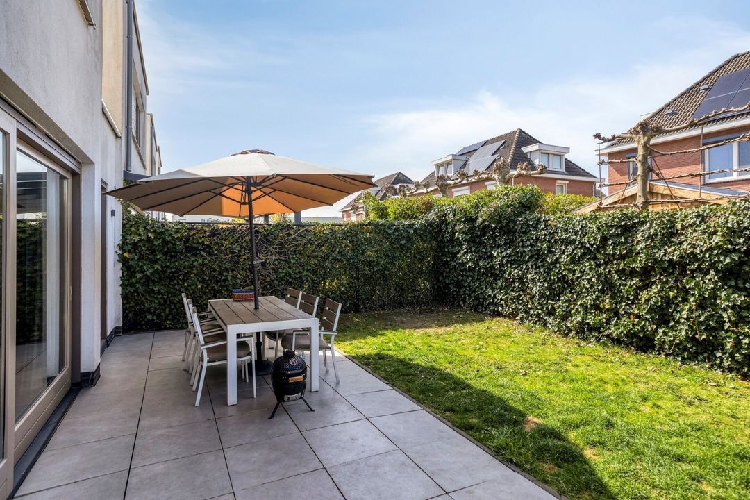 Via de schuifpui in de woonkamer en de deur in de bijkeuken bereikt u de sfeervolle, uitnodigende en volledig omheinde achtertuin. De tuin beschikt over een ruim terras, grenzend aan de leefruimte, met aansluitend een gazon.