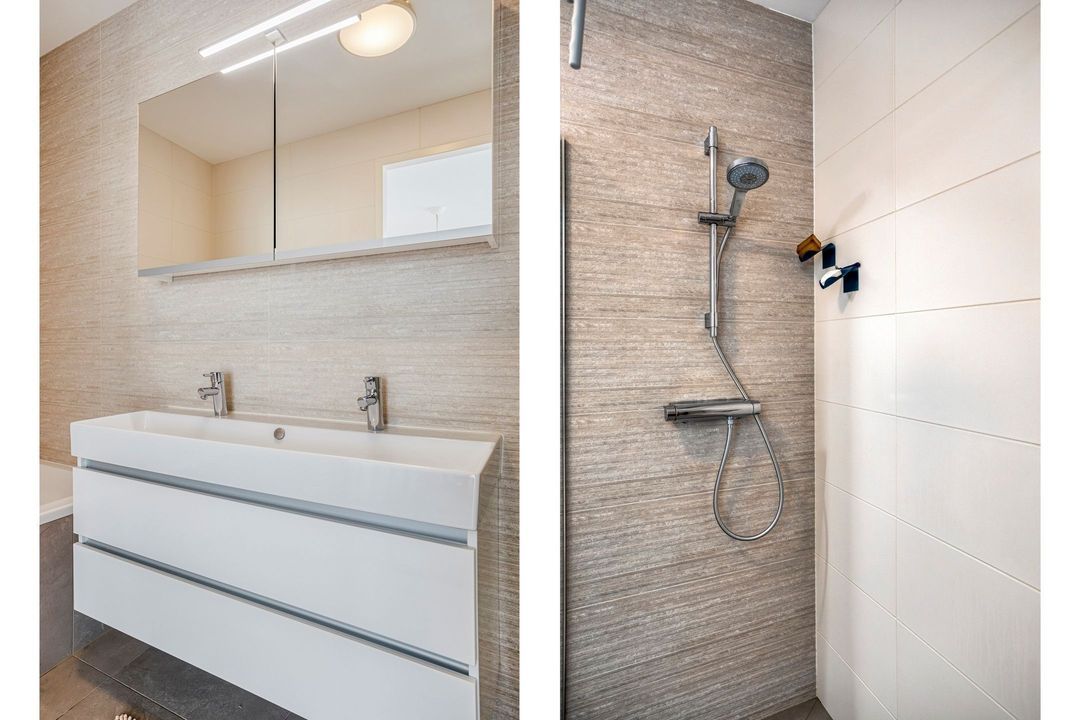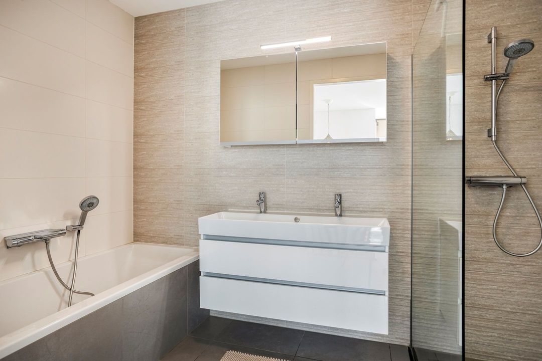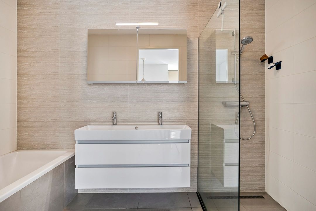 • Badkamer: De ruime, betegelde badkamer is ca. 6 m² en is voorzien van een dubbele wastafel, inloopdouche en een ligbad.