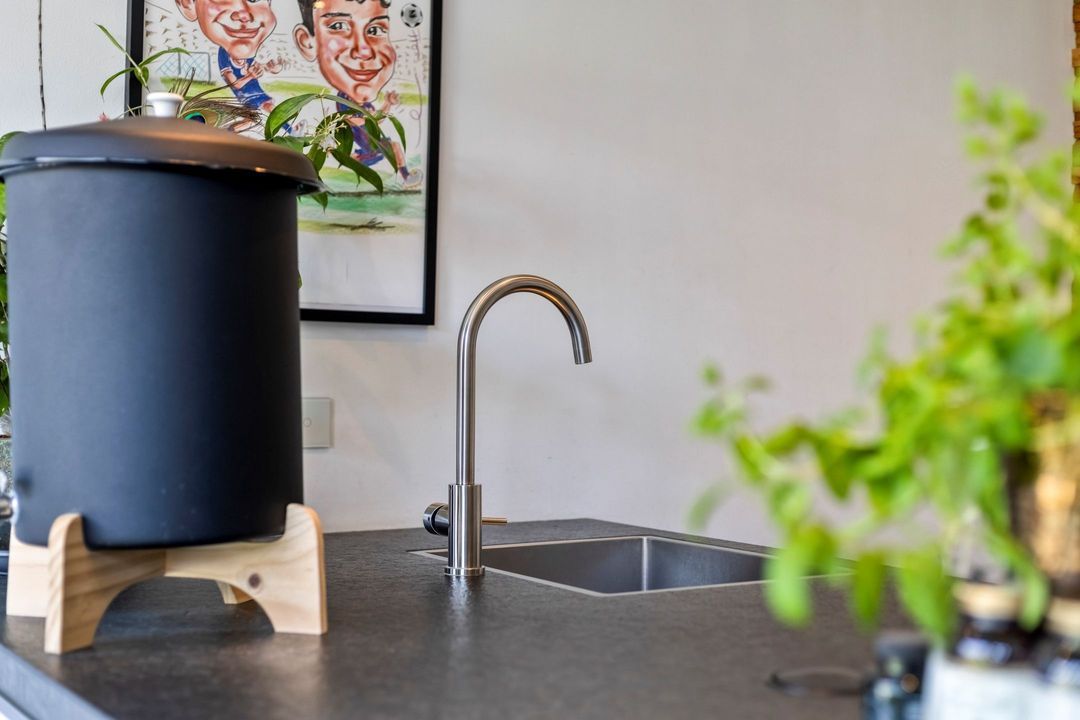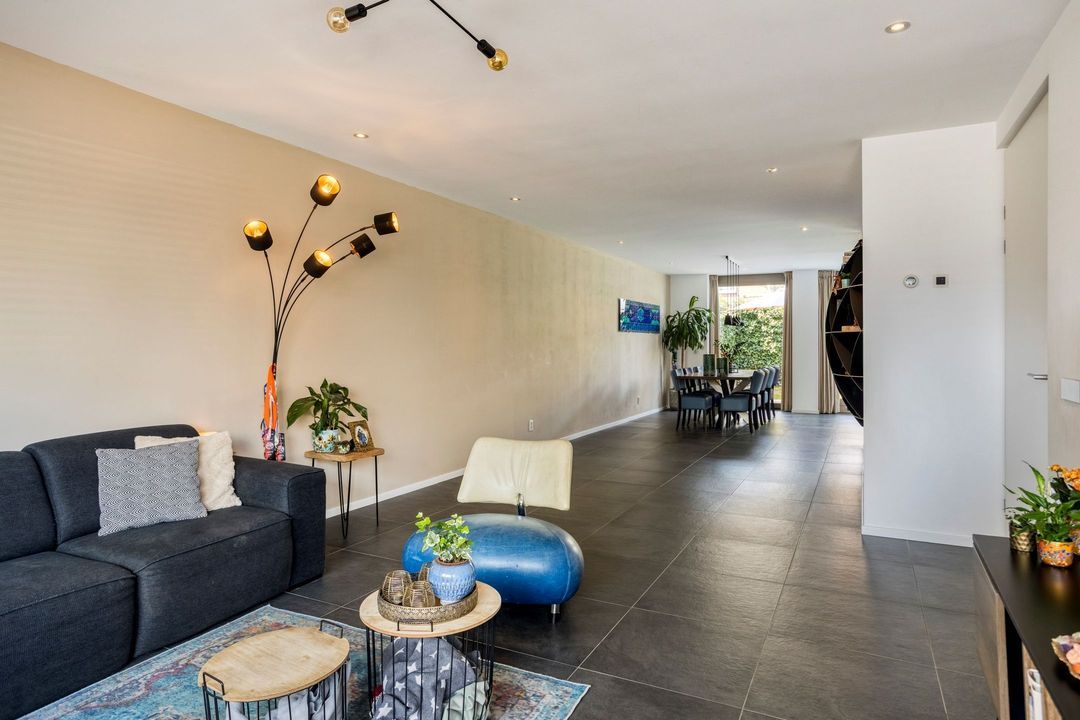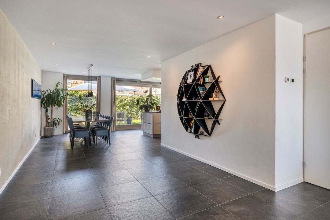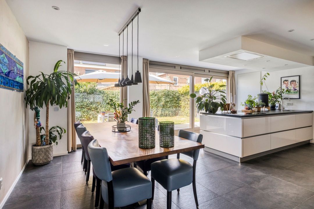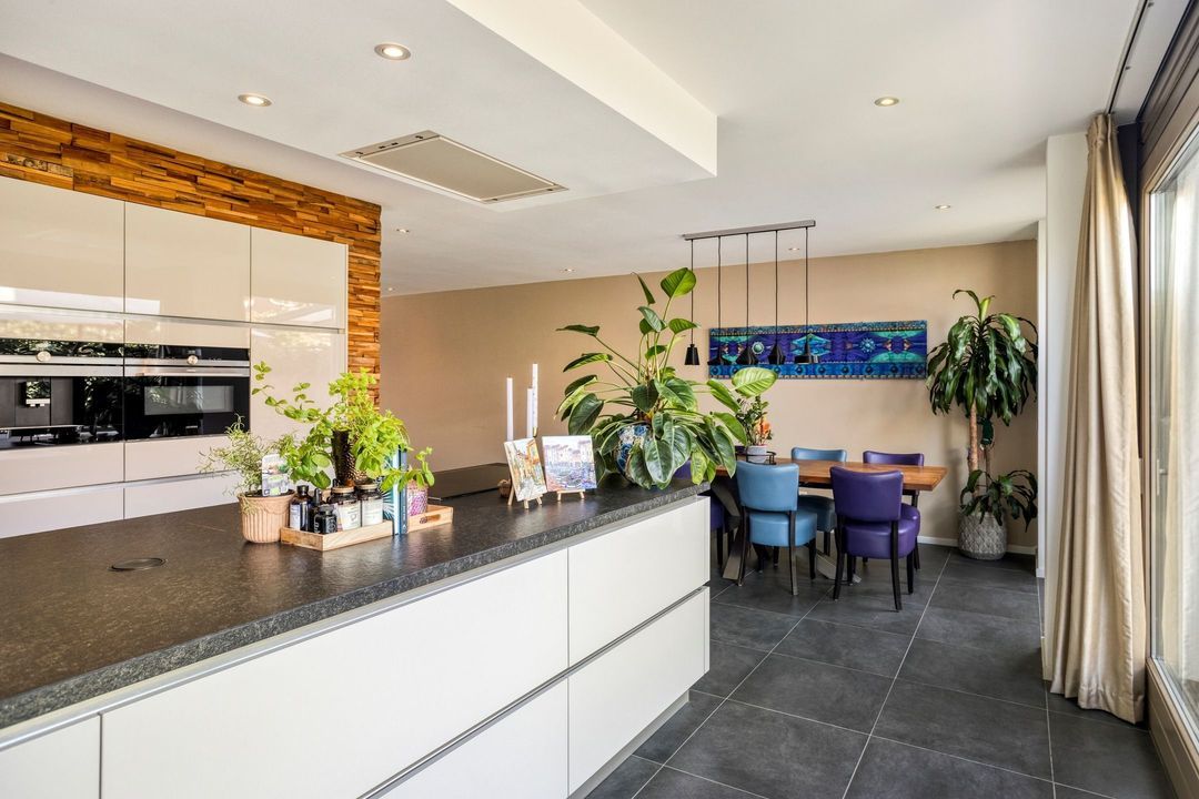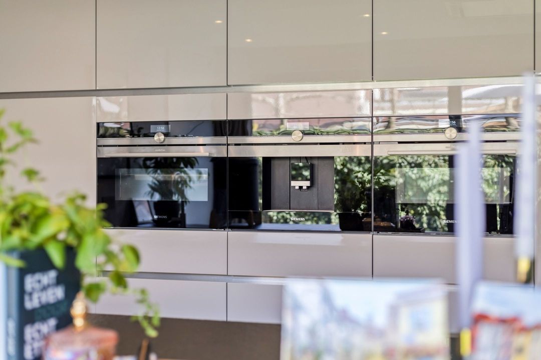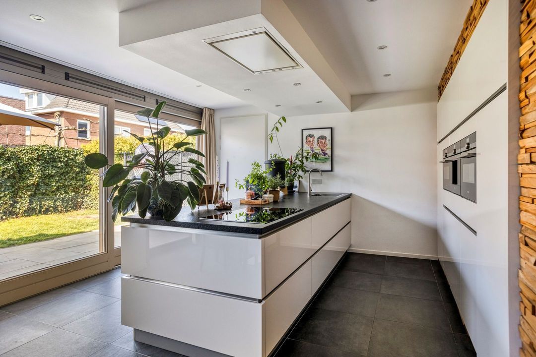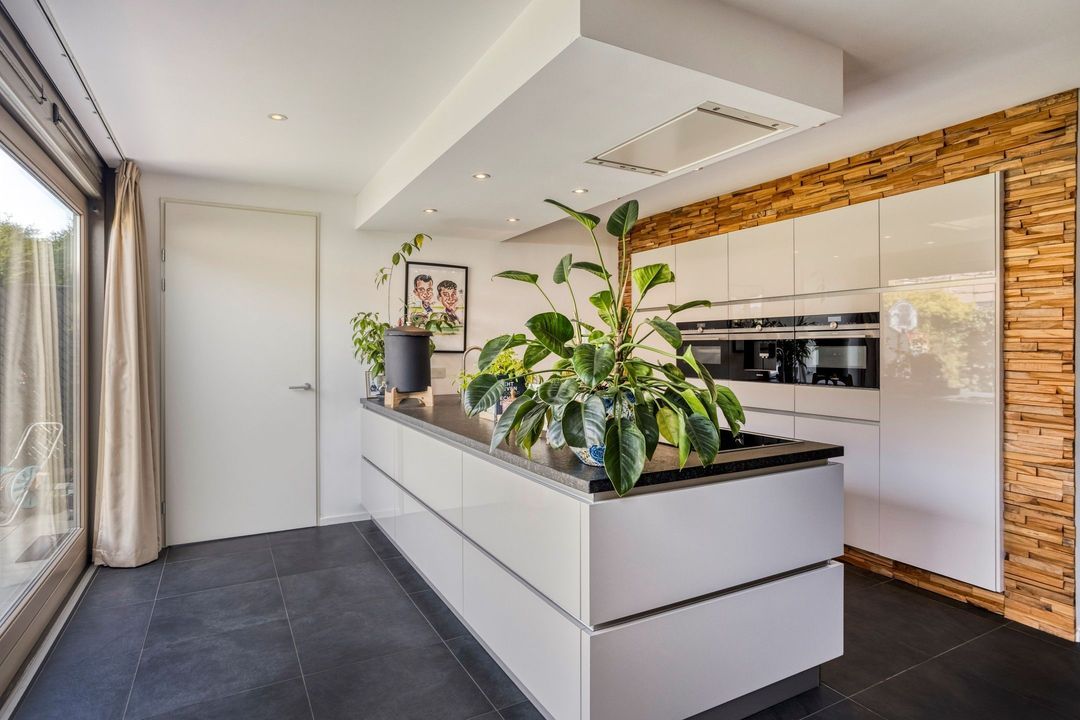 Aan de voorzijde bevindt zich het zitgedeelte, terwijl de moderne keuken aan de achterzijde is gesitueerd. Deze keuken heeft een strak, greeploos design en is uitgevoerd met een gevlamd granieten werkblad. De keuken is compleet uitgerust met hoogwaardige inbouwapparatuur, waaronder een inductiekookplaat, plafondafzuigkap, stoomoven, combi-oven, koffieapparaat, koelkast en vaatwasser. De royale schuifpui zorgt voor een naadloze overgang naar de tuin en versterkt het binnen-buitengevoel.