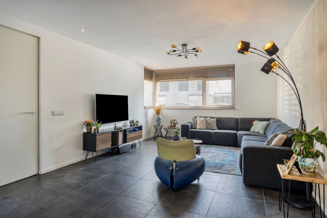 De bijzonder ruime leefruimte van circa 62 m², bestaande uit de woonkamer en de open keuken, vormt het hart van de woning. Dankzij de grote ramen aan zowel de voor- als achterzijde geniet u hier van een prachtige lichtinval gedurende de dag. De ruimte is afgewerkt met een donkere tegelvloer met subtiel reliëf en voorzien van comfortabele vloerverwarming.