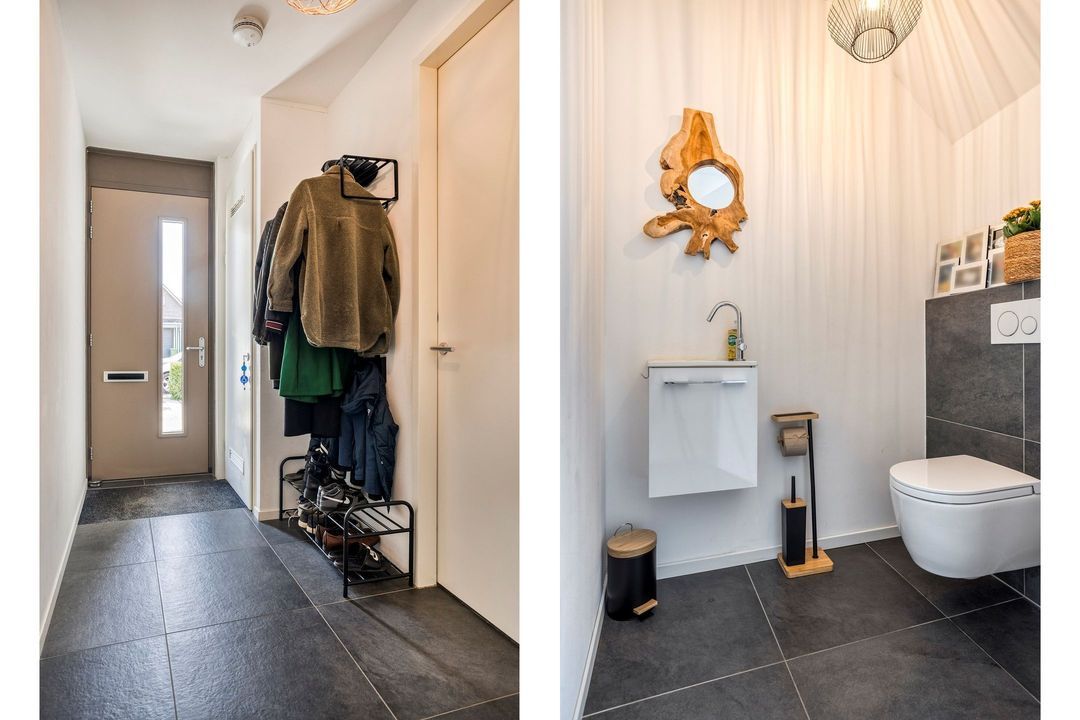 Stap binnen in deze fraaie woning en ervaar direct de moderne uitstraling en het royale gevoel van ruimte. De open indeling en grote raampartijen zorgen voor een lichte, uitnodigende sfeer. Via de entree (ca. 8,5 m²) komt u binnen, waar zich de meterkast, de trapopgang naar de eerste verdieping, de toiletruimte en de toegang tot de woonkamer en keuken bevinden. De moderne toiletruimte is stijlvol afgewerkt en voorzien van een hangcloset en fonteintje.