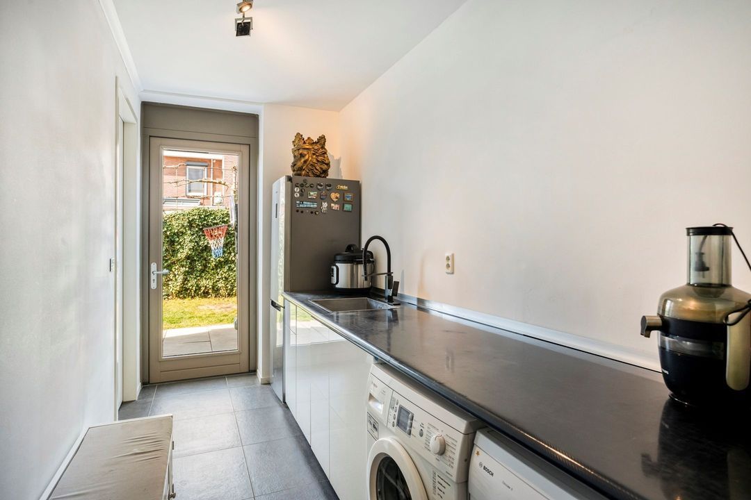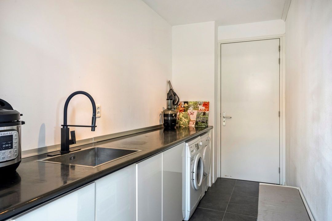 Aansluitend aan de keuken ligt de volledig betegelde bijkeuken (ca. 8 m²), die zowel vanuit de keuken, de garage, als via de tuin bereikbaar is. Deze praktische ruimte beschikt over een keukenblok, veel bergruimte en biedt plaats voor extra apparatuur zoals een vriezer. Tevens bevinden zich hier de aansluitingen voor het witgoed. Vanuit de bijkeuken heeft u direct toegang tot de garage.