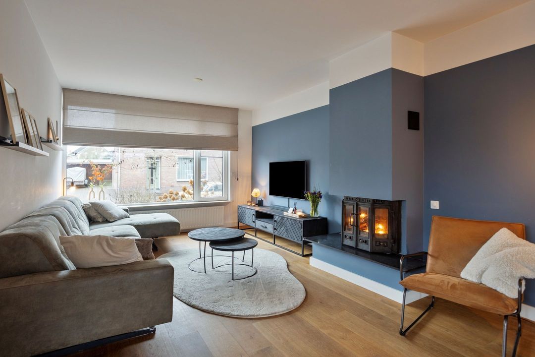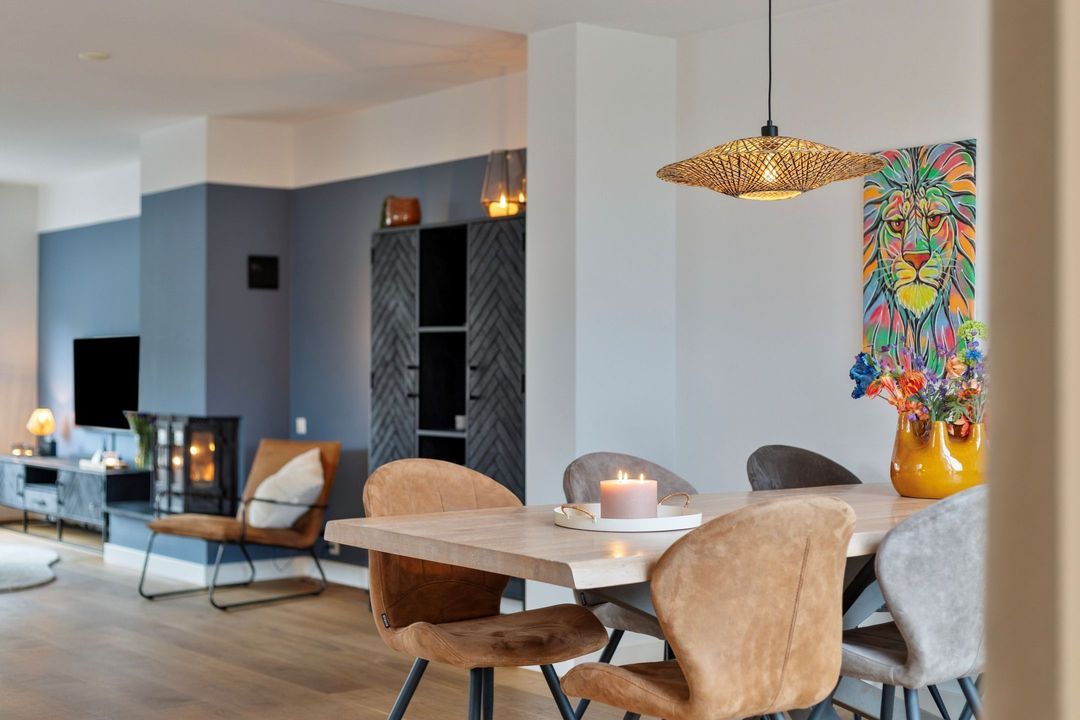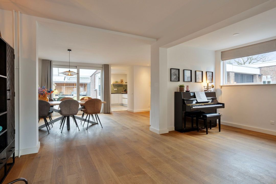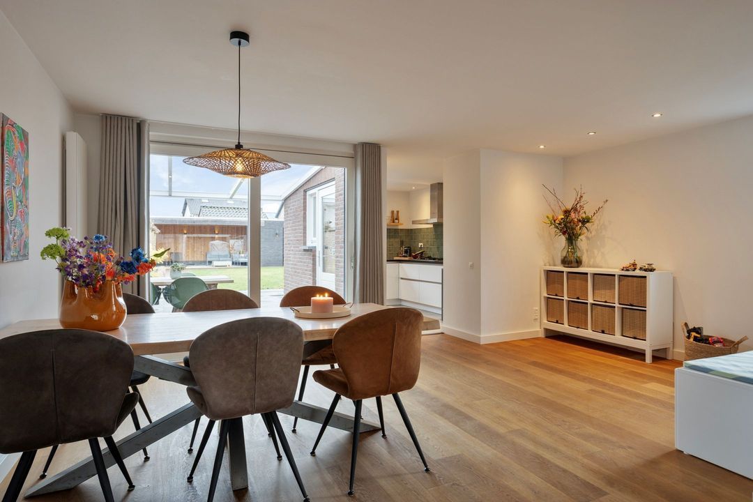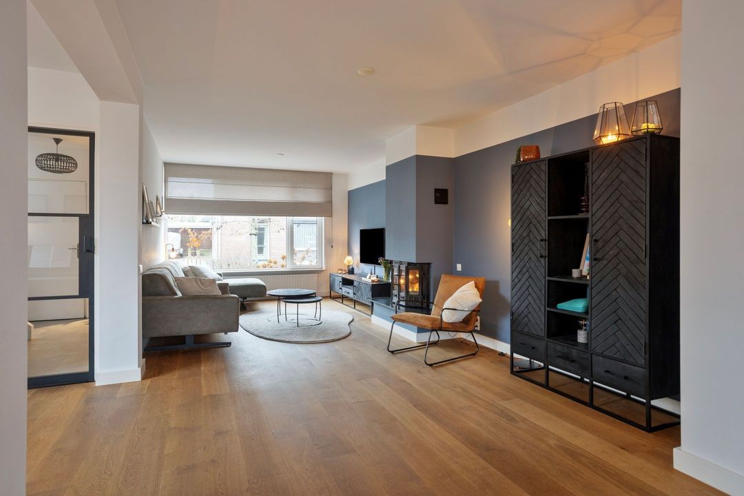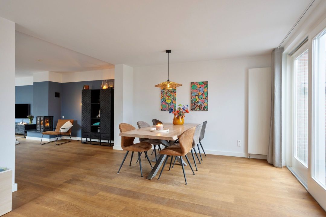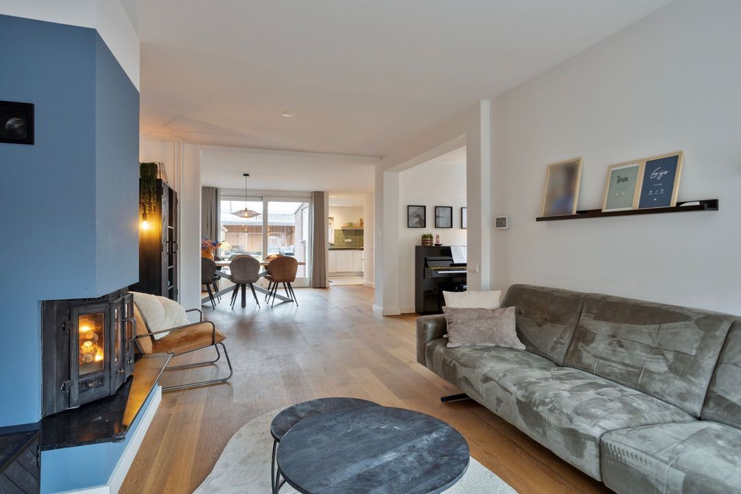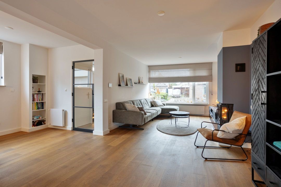 Via een stijlvolle zwartstalen deur bereikt u de royale woonkamer met open keuken, samen goed voor circa 55 m² aan leefruimte. Een warmgekleurde parketvloer zorgt voor een sfeervolle uitstraling, terwijl de grote raampartijen aan de voorzijde en de schuifdeuren aan de achterzijde zorgen voor een uitstekende lichtinval. De centraal geplaatste houtkachel vormt een echte blikvanger.
