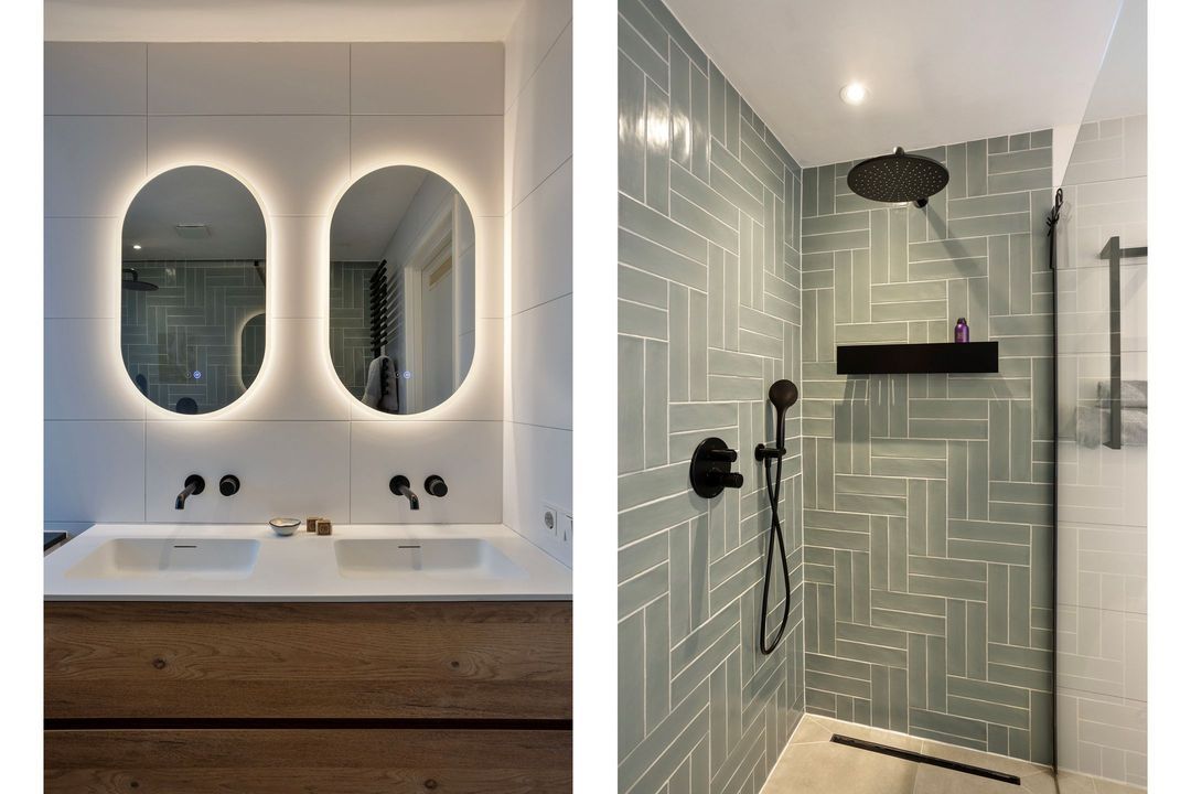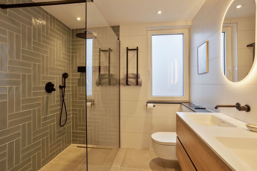 • Badkamer: Volledig vernieuwd in 2023, circa 5 m² groot en voorzien van een ruime inloopdouche met regendouche, een wastafelmeubel met dubbele wastafel, hangcloset en elektrische vloerverwarming.