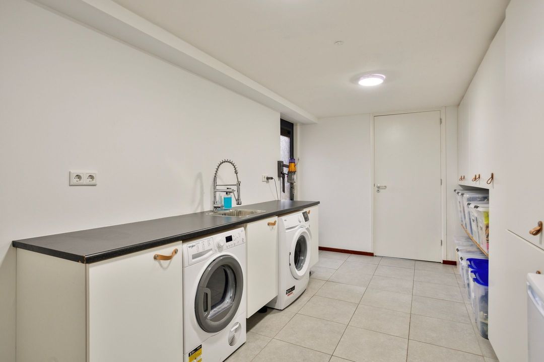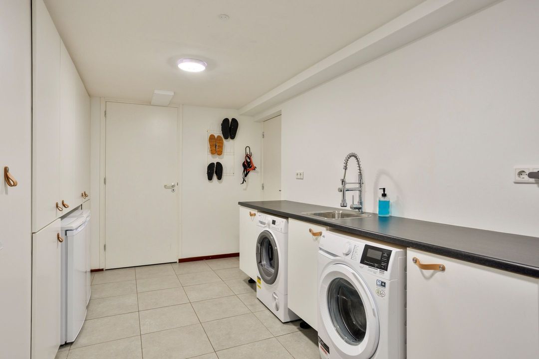 Aangrenzend bevindt zich de ruime bijkeuken van circa 12 m², gesitueerd in de garage. Deze ruimte is voorzien van een tegelvloer, witgoedaansluitingen en veel praktische opbergmogelijkheden. Daarnaast beschikt de bijkeuken over een keukenblok met spoelbak en extra kastruimte. Vanuit de bijkeuken bereikt u een extra kamer die geschikt is als kantoorruimte of berging, evenals een separate bergruimte aan de voorzijde van de voormalige garage, ideaal voor fietsen of opslag. Tevens heeft u vanuit de bijkeuken toegang tot de tuin, wat de ruimte multifunctioneel en bijzonder praktisch maakt.