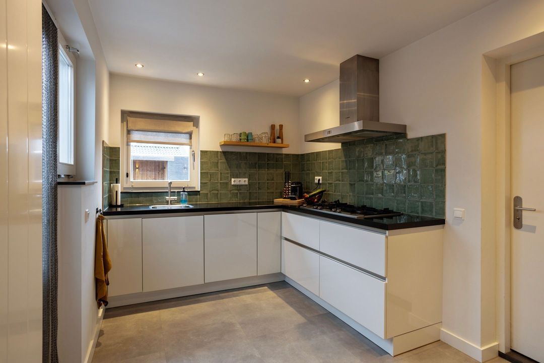 De moderne open keuken aan de achterzijde is uitgevoerd in een praktische L-opstelling met witte greeploze fronten en een zwart natuurstenen werkblad. De keuken beschikt over diverse inbouwapparatuur, waaronder een 5-pits gasfornuis, afzuiging, combi-oven, vaatwasser en koelkast. De combinatie van veel werk- en bergruimte met een strak design maakt de keuken zowel praktisch als eigentijds.