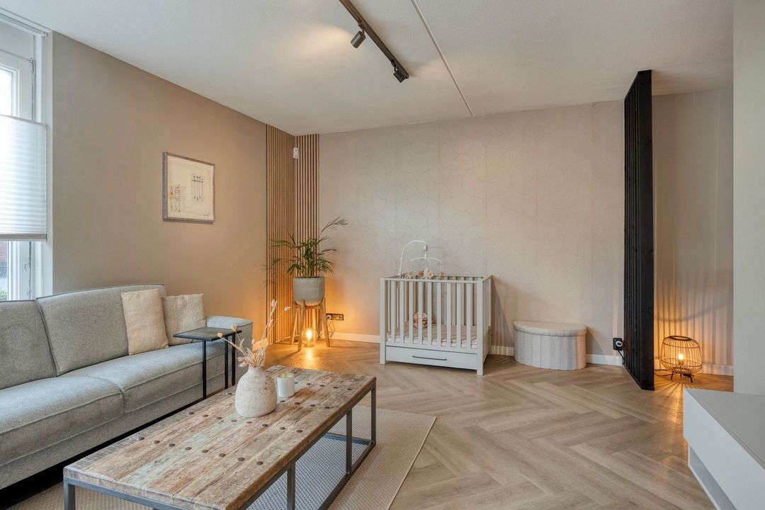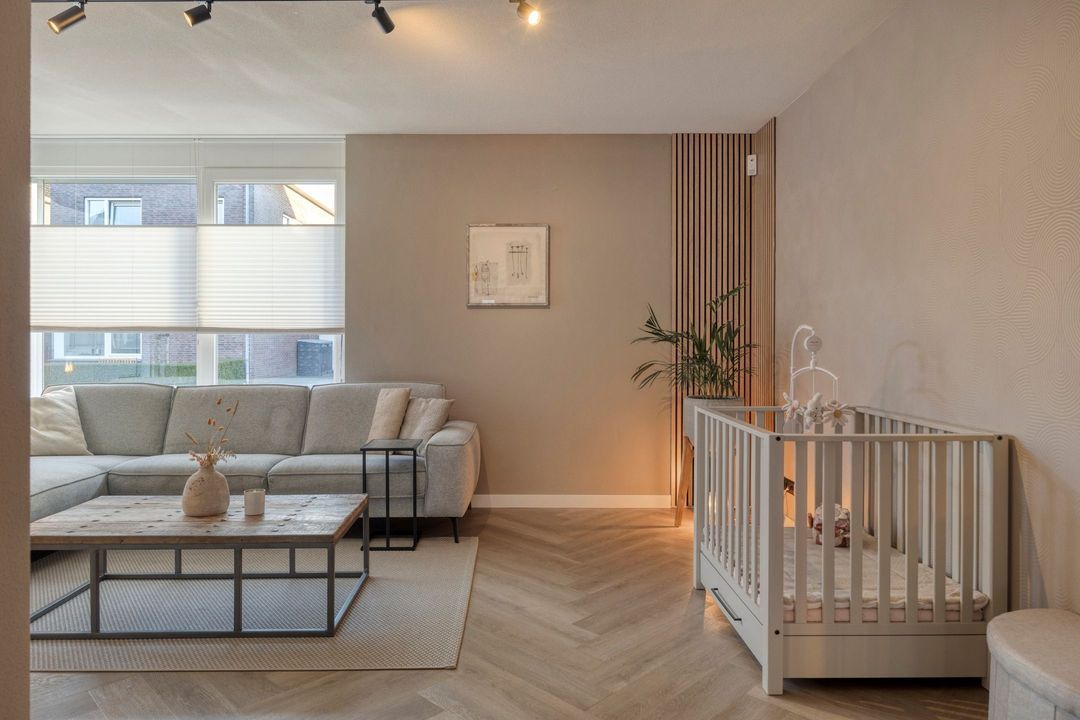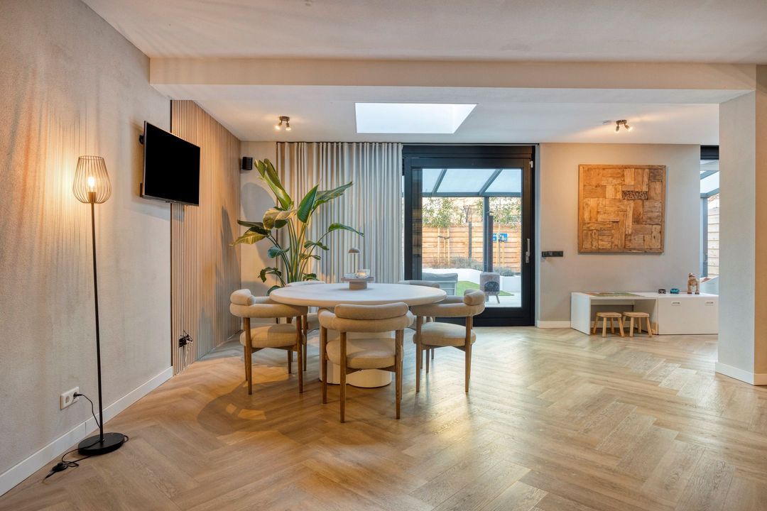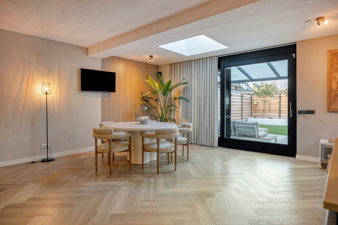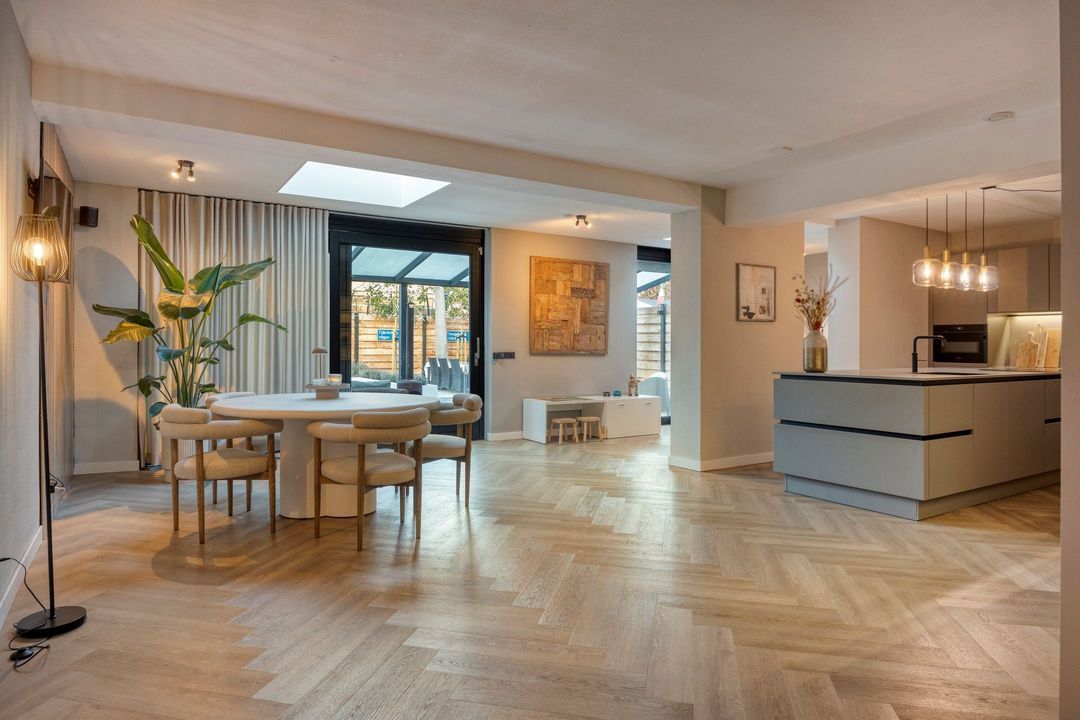 De sfeervolle woonkamer/eetkamer en keuken is zelfs meer dan 80 m² (!) en wordt gekenmerkt door veel lichtinval dankzij de royale raampartijen aan de voorzijde en de grote schuifpui aan de achterzijde. Deze schuifpui zorgt tevens voor een optimale verbinding met de tuin. De visgraatvloer uit de entree loopt naadloos door in de leefruimte, wat het geheel een rustige en luxe uitstraling geeft.