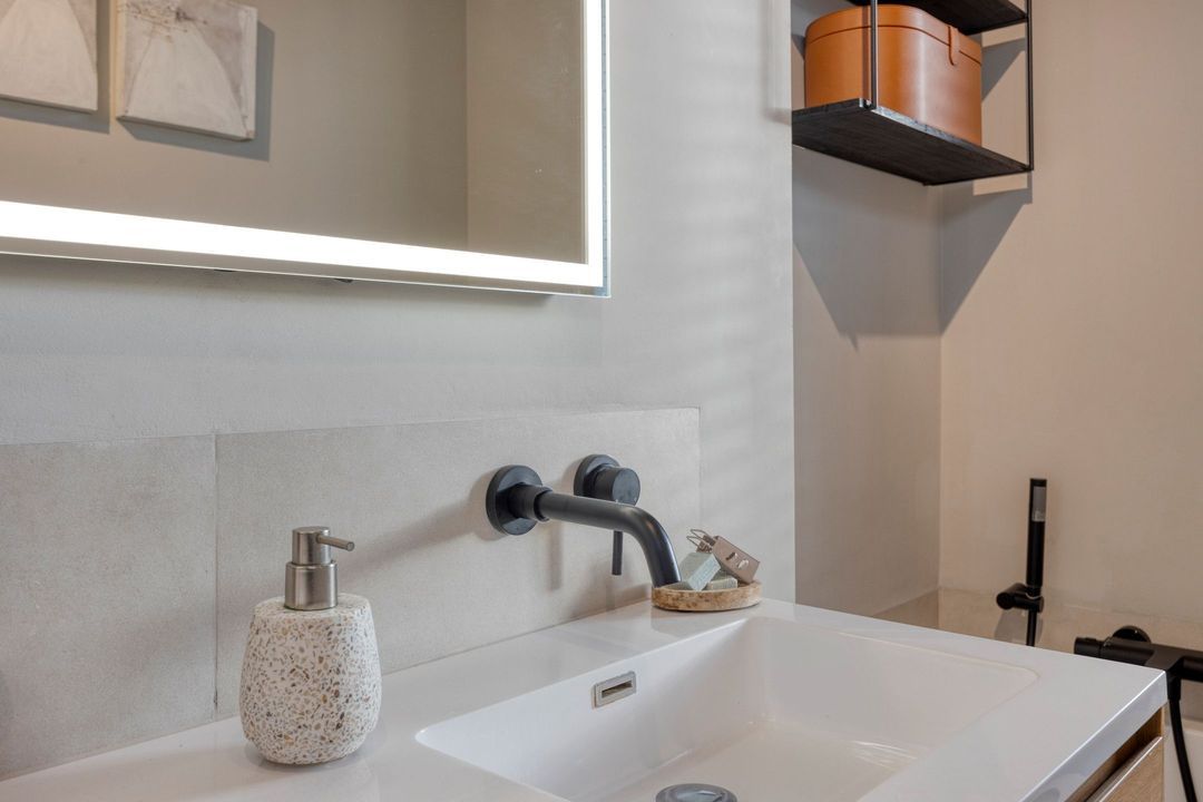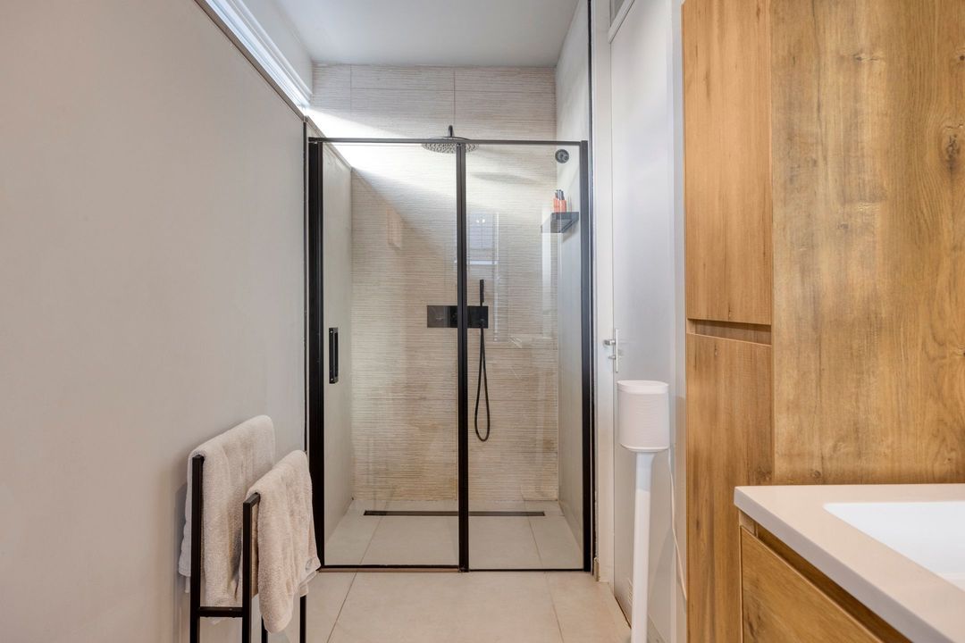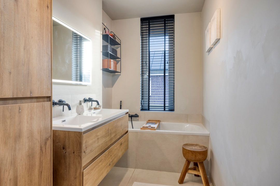 • Badkamer: De moderne, betegelde badkamer (2023) is ca. 7 m² groot en voorzien van een inloopdouche, een ligbad en een wastafelmeubel met dubbele wasbak. De badkamer is tevens voorzien van elektrische vloer- en zelfs gedeeltelijk muurverwarming.