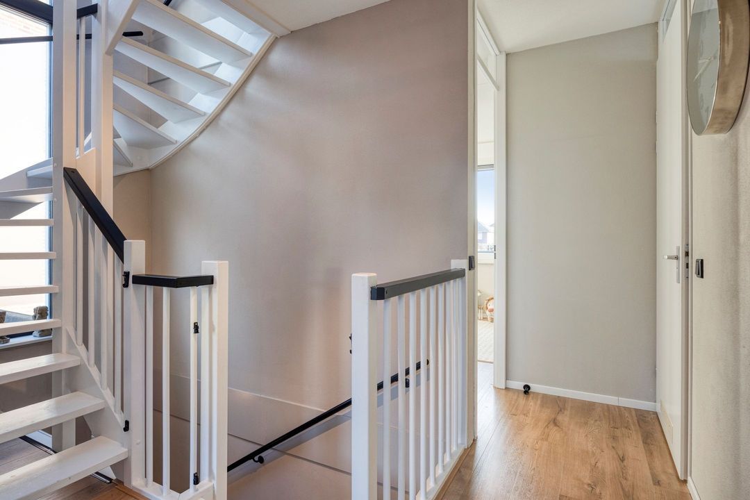 Via de trap bereikt u de ruime overloop (ca. 9 m²). Op deze verdieping bevinden zich drie goed ingedeelde slaapkamers, een moderne badkamer, een separate toiletruimte en een vaste trap naar de tweede verdieping. Ook deze verdieping is voorzien van een lichte laminaatvloer.