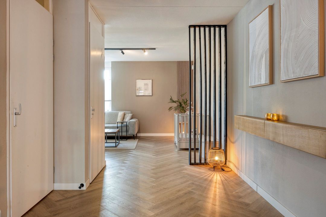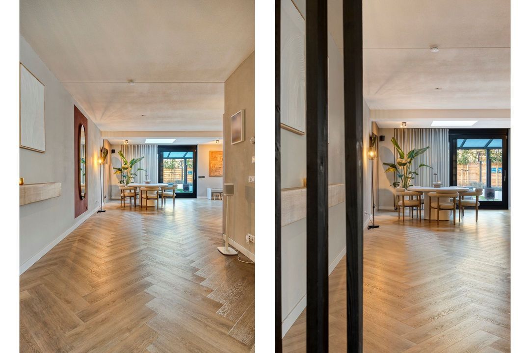 U betreedt de woning via een ruime en uitnodigende entree (ca. 9 m²), afgewerkt met een prachtige visgraatvloer die direct de hoogwaardige sfeer van de woning weerspiegelt. In de hal bevinden zich de garderobe, de meterkast, de moderne toiletruimte met hangcloset en de trap naar de eerste verdieping. Vanuit de entree bereikt u de royale woonkamer met open keuken. De gehele begane grond is voorzien van comfortabele vloerverwarming.