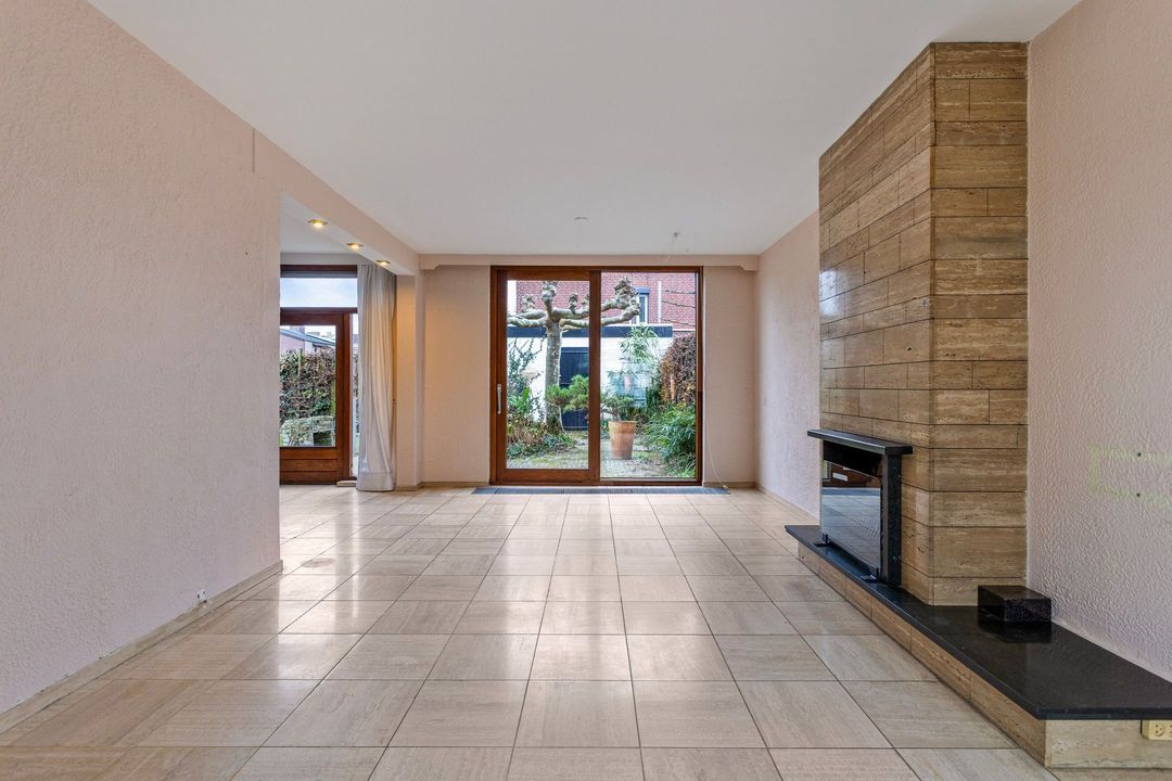 De woonkamer met open keuken heeft een gezamenlijke oppervlakte van ca. 34 m² en is afgewerkt met dezelfde tegelvloer, wat zorgt voor een rustige en uniforme uitstraling. Grote raampartijen en een schuifpui naar de tuin zorgen voor een prettige lichtinval en een sterke verbinding met buiten. De centraal geplaatste haard vormt een sfeervol middelpunt en geeft de leefruimte een warme, uitnodigende uitstraling.