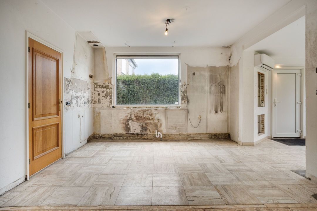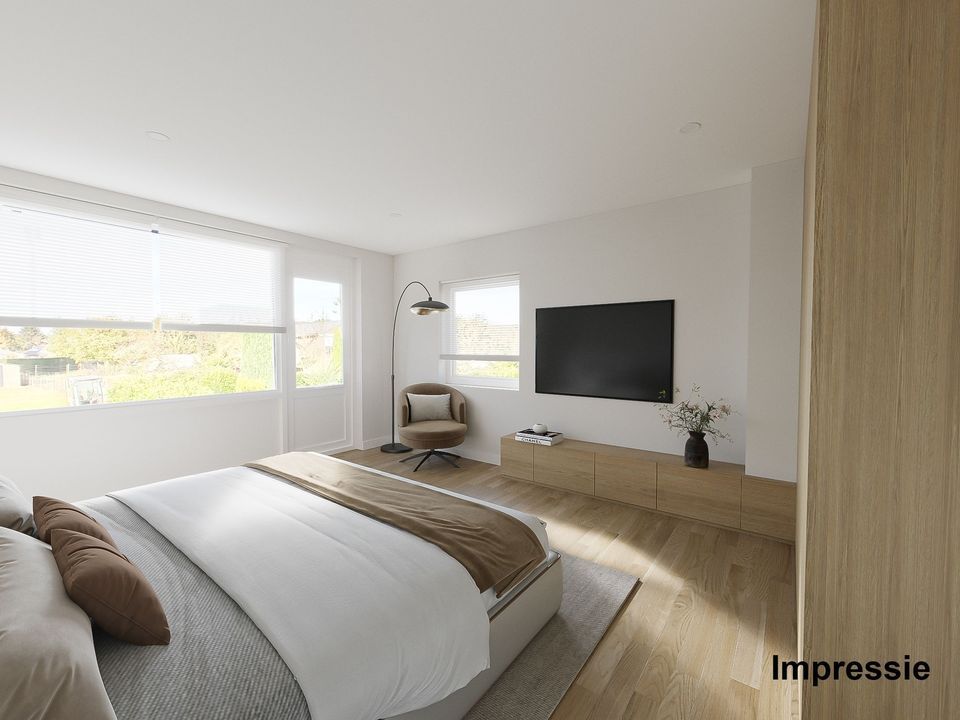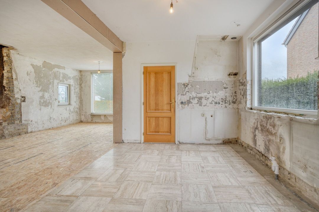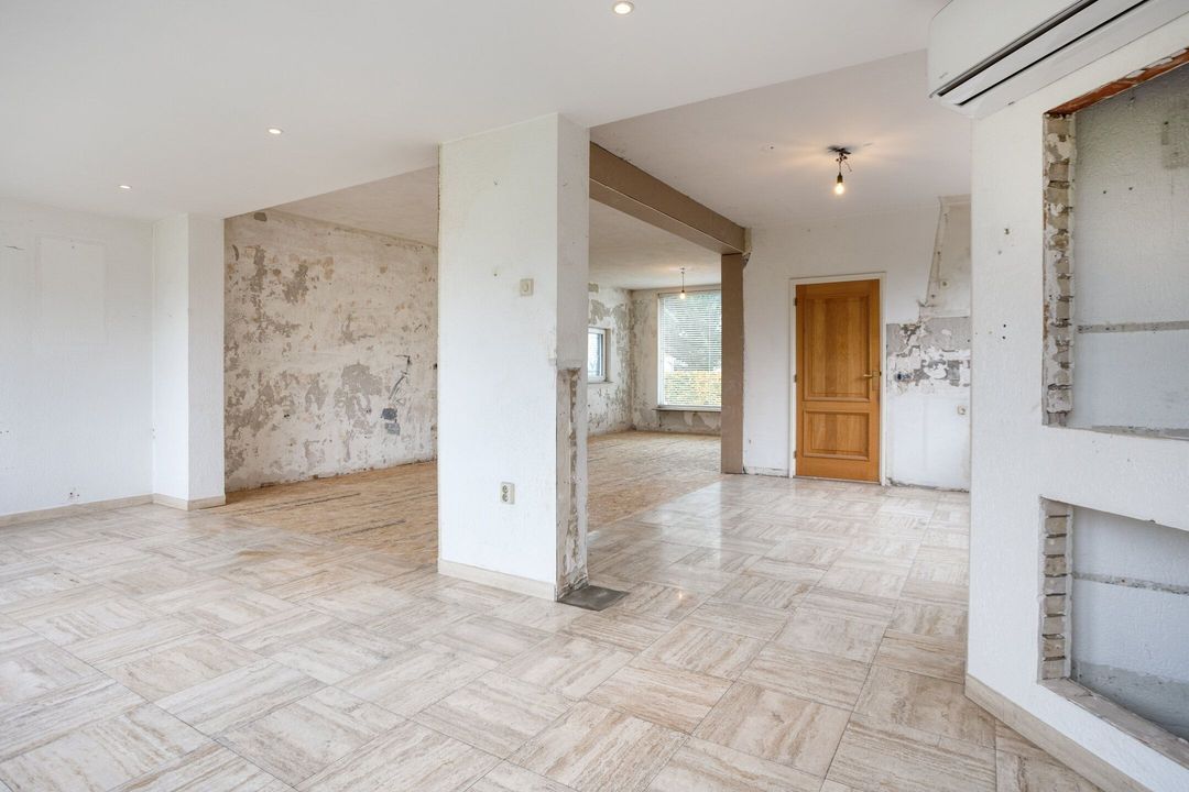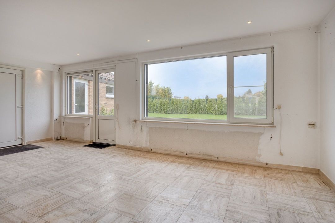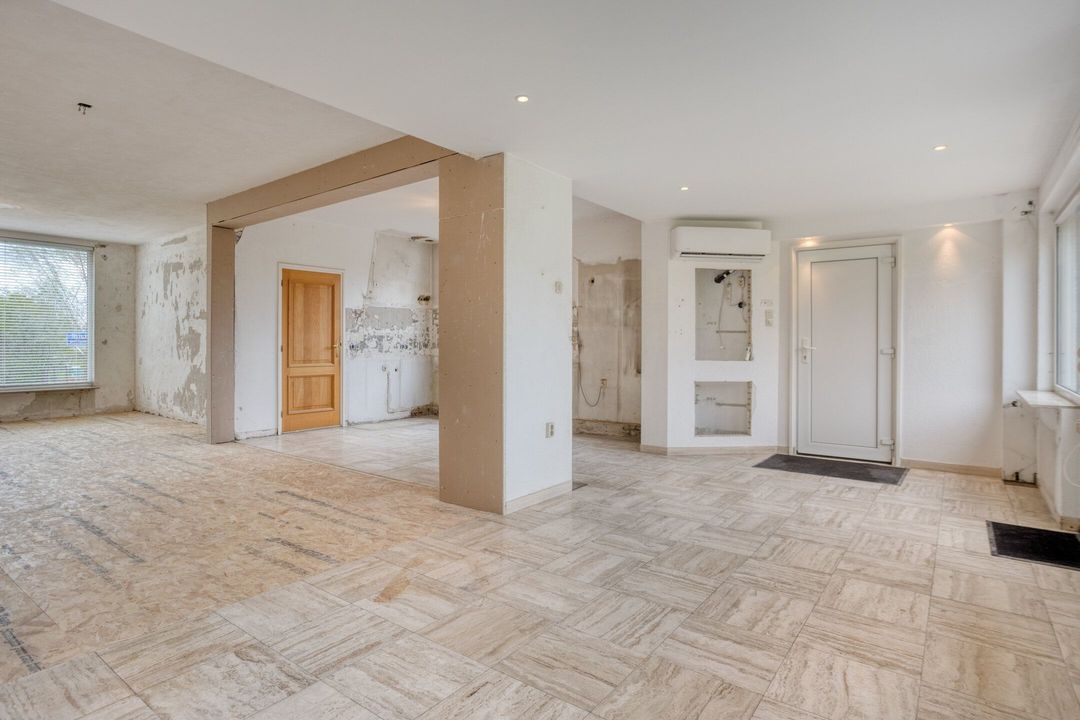 De royale woonkamer en open keuken van samen ca. 63 m² zijn bijzonder licht door de grote raampartijen aan zowel de voor- als achterzijde. Het vrije uitzicht op de omliggende weilanden versterkt het gevoel van ruimte en rust. Extra comfort biedt de aanwezige airconditioning, die zowel kan koelen als verwarmen. Vanuit de achterzijde van deze leefruimte heeft u directe toegang tot de oprit, wat praktisch gemak biedt. Er is geen keuken aanwezig. Er is een impressie bijgevoegd wat het eindresultaat kan worden na verbouwing. De vorige eigenaar heeft reeds voorbereidingen getroffen om de keuken bij de woonkamer te betrekken. Alle behang is reeds van de muren verwijderd, dus volledig voorbereidt voor uw verdere wensen.
