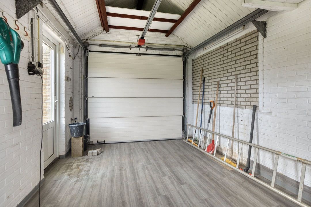 De ruime garage van ca. 15 m² is voorzien van een elektrisch bedienbare poort aan de ene zijde en een handmatige poort aan de andere zijde. Tevens is de garage toegankelijk via de tuin. Met elektra- en wateraansluiting. Deze garage biedt voldoende plek voor fietsen of het opslaan van andere spullen. De royale oprit biedt daarnaast parkeergelegenheid voor meerdere auto’s.