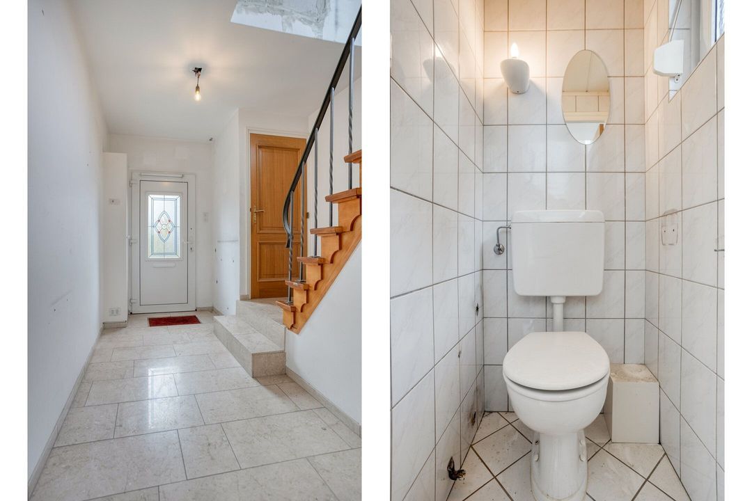 Bij binnenkomst in de ruime hal (ca. 6 m²) valt direct de lichte tegelvloer op, die de ruimte een frisse en uitnodigende uitstraling geeft. Vanuit de hal heeft u toegang tot de toiletruimte, de woonkamer met muurdoorbraak naar de voormalige keuken, de kelder en de trap naar de eerste verdieping. De betegelde toiletruimte is voorzien van een staand toilet en een fonteintje.