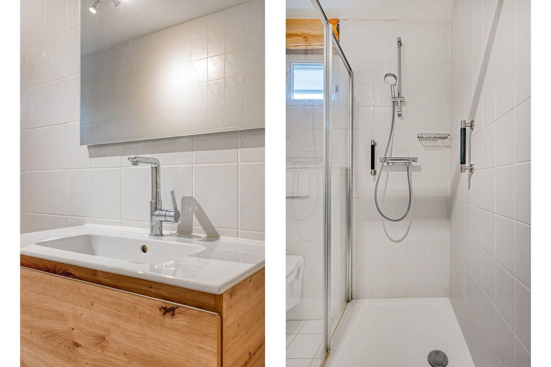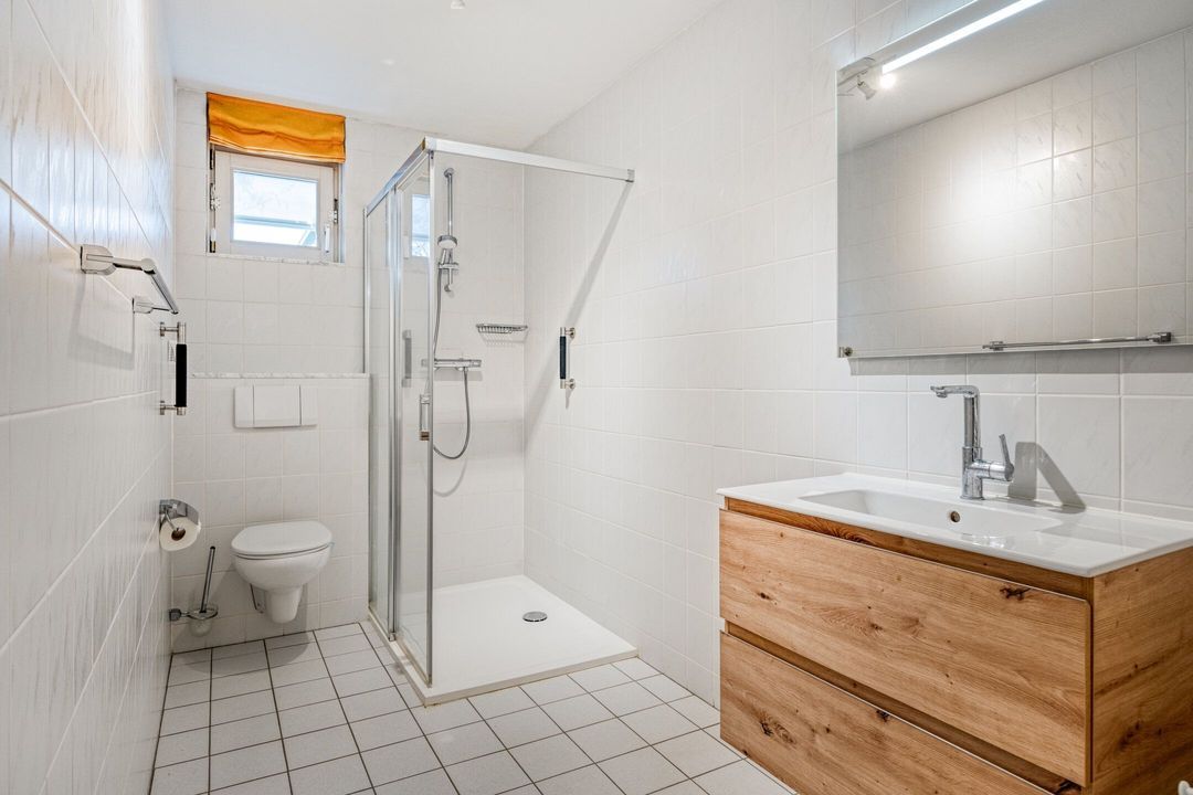 • Badkamer: De betegelde en nette badkamer is ca. 5,5 m² groot, en voorzien van een douchecabine, een wastafelmeubel, een designradiator en een hangcloset.