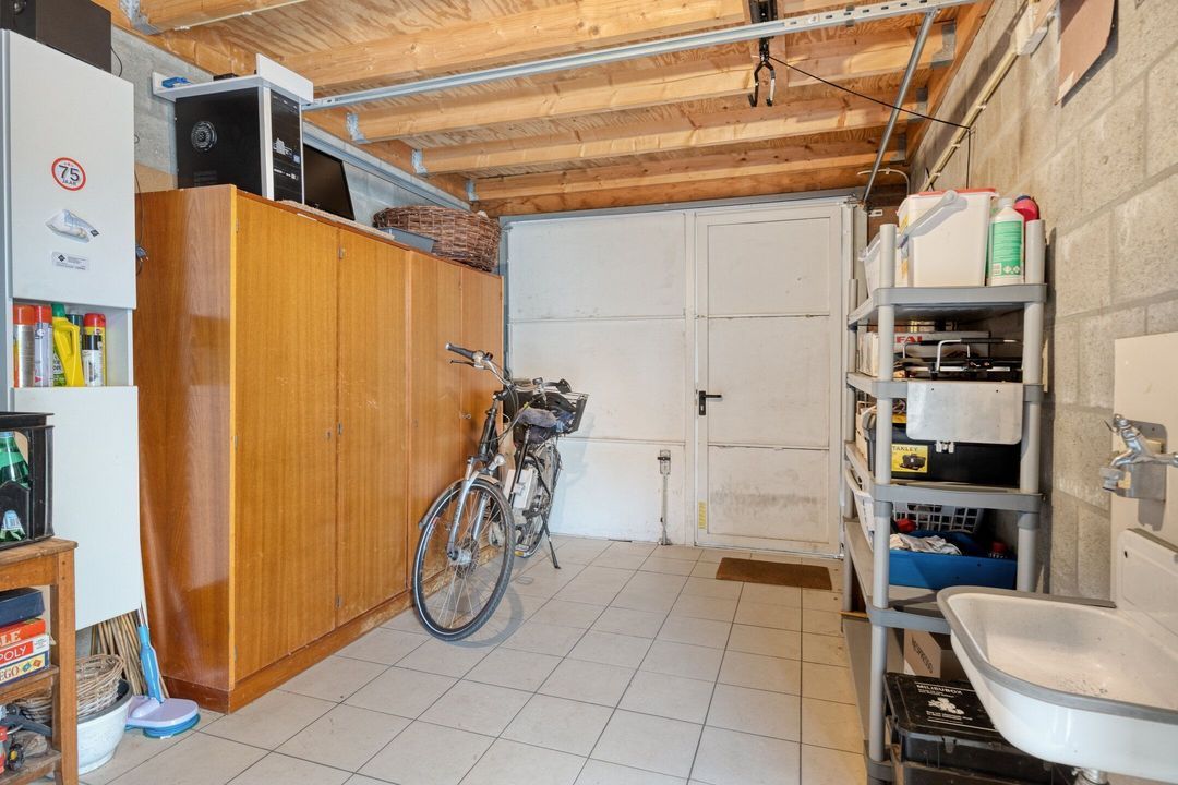 De betegelde garage (ca. 18 m²) is zowel via de oprit als via de tuin toegankelijk. Deze multifunctionele ruimte is geschikt voor het parkeren van een auto, het stallen van fietsen of als extra bergruimte. De garage is voorzien van elektriciteit, krachtstroom, een spoelbak en aansluitingen voor witgoed.