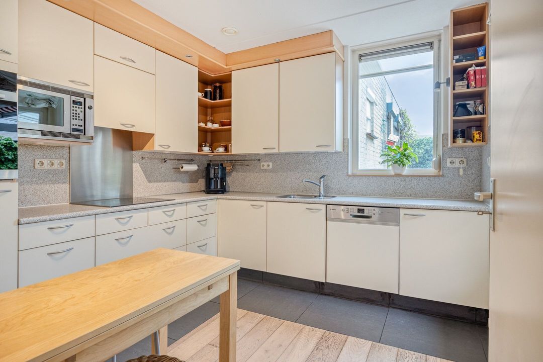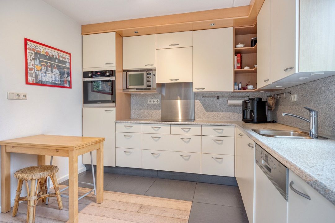 Aansluitend bereikt u de keuken (ca. 9 m²), die in een praktische L-opstelling is geplaatst. De keuken is compleet uitgerust met een elektrische kookplaat, afzuigkap, oven, magnetron, vaatwasser en koelkast. Ook vanuit de keuken is de tuin eenvoudig bereikbaar.