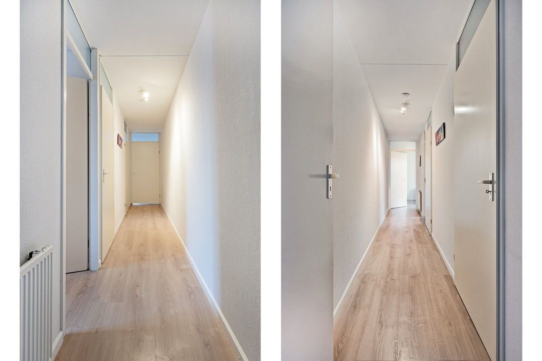 Vanuit de woonkamer bereikt u een tussenhal, die toegang biedt tot de twee slaapkamers, de badkamer en de bergruimte. Deze ruimtes, met uitzondering van de badkamer, zijn voorzien van een laminaatvloer.