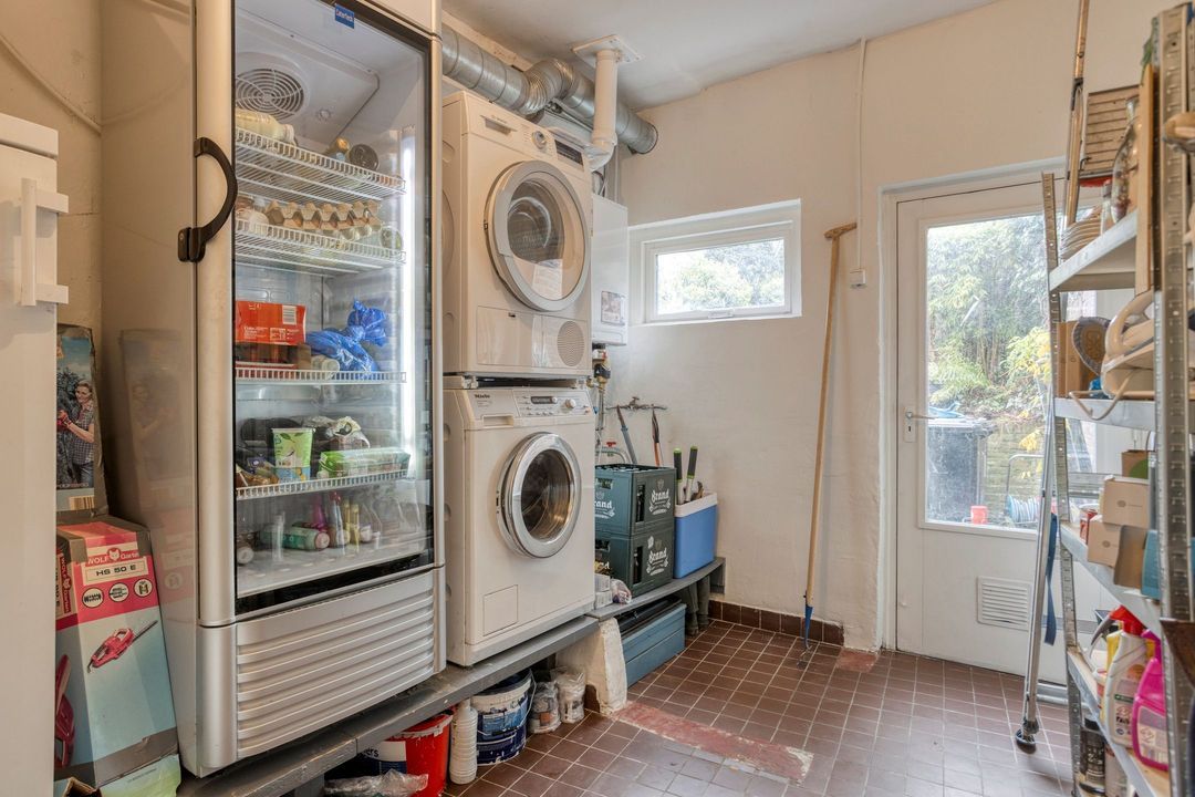 Aangrenzend aan de garage bevindt zich de ruime berging/bijkeuken van ca. 9 m². Deze ruimte is toegankelijk vanuit de garage en via een deur naar de tuin. Hier vindt u de witgoedaansluitingen en is er voldoende plek voor een vriezer, voorraadopslag of extra bergruimte. Tevens is hier de cv-installatie geplaatst (Intergas, Huur, 2023).