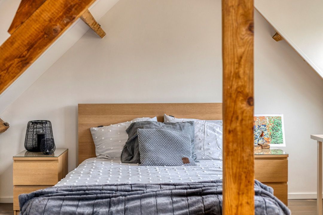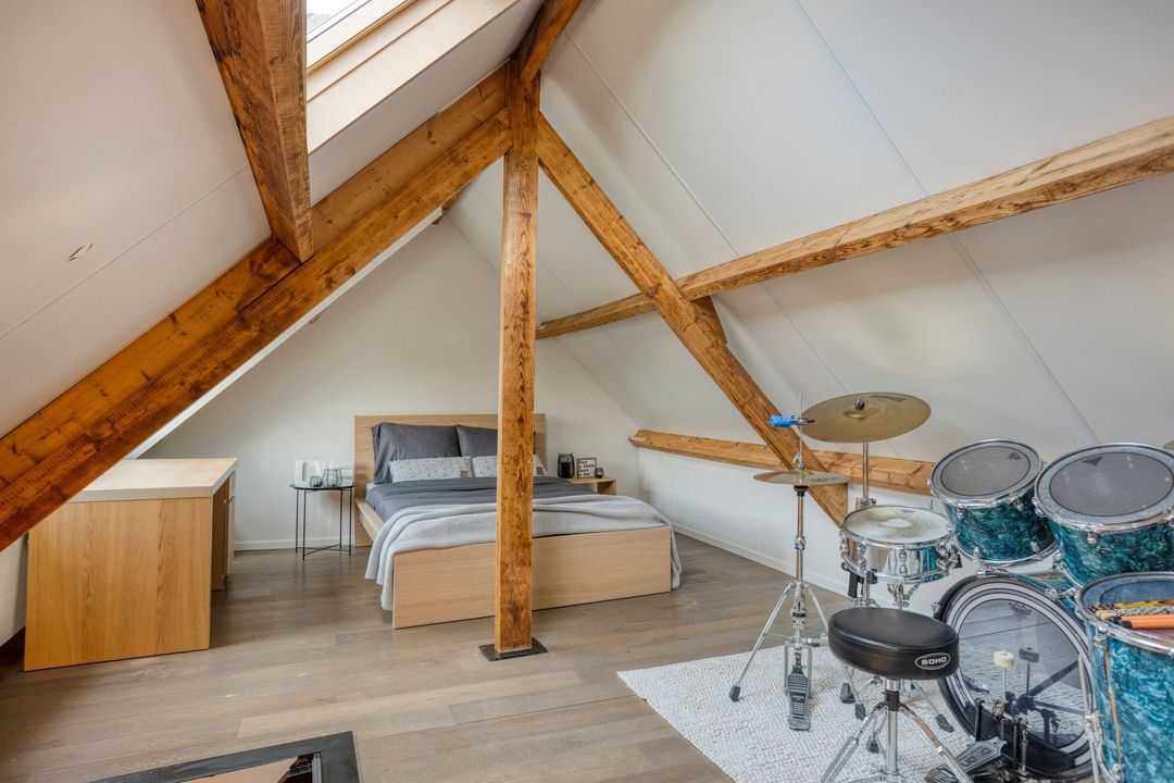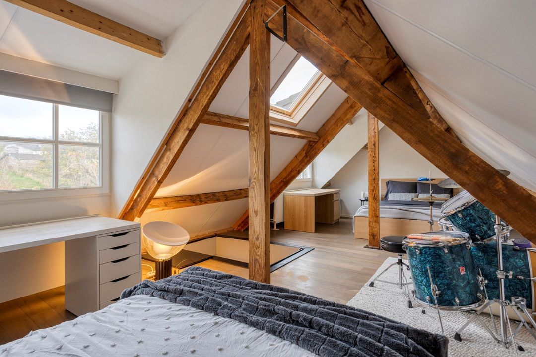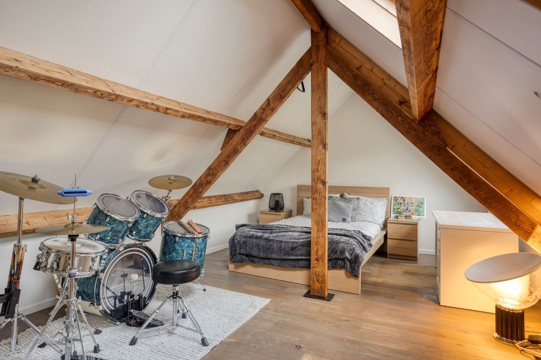 •Slaapkamer 2: Deze bijzonder ruime kamer van ca. 35 m² wordt gekenmerkt door een prachtige lichtinval dankzij de vele raampartijen. De karakteristieke balken aan het plafond geven de ruimte een sfeervolle en authentieke uitstraling. De kamer biedt volop mogelijkheden: te gebruiken als slaapkamer, hobbyruimte, werkplek of een combinatie daarvan.