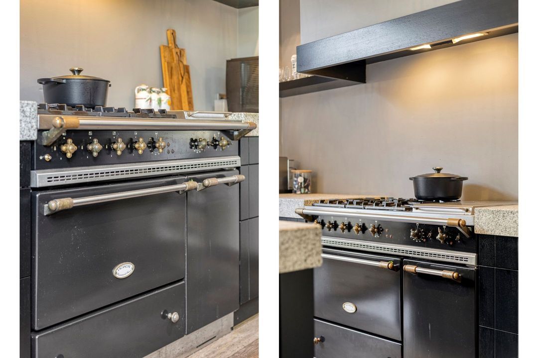 De landelijke, open keuken, voorzien van robuust, composieten werkblad en zwarten houten fronten, is gelegen aan de achterzijde en vormt een prettige plek om te koken en samen te zijn. De keuken is goed onderhouden en voorzien van een 5-pits fornuis, afzuigkap, vaatwasser en koelkast. Het fornuis van het merk 'Lacanche' is een uniek en duurzaam fornuis, opgebouwd uit professionele componenten, waaronder een grote oven met daaronder een oven-lade, ernaast een garings oven/warmhoudkast, 4 gaspitten en een plancha). Het ruime werkblad en de praktische indeling maken deze keuken zowel sfeervol als functioneel.