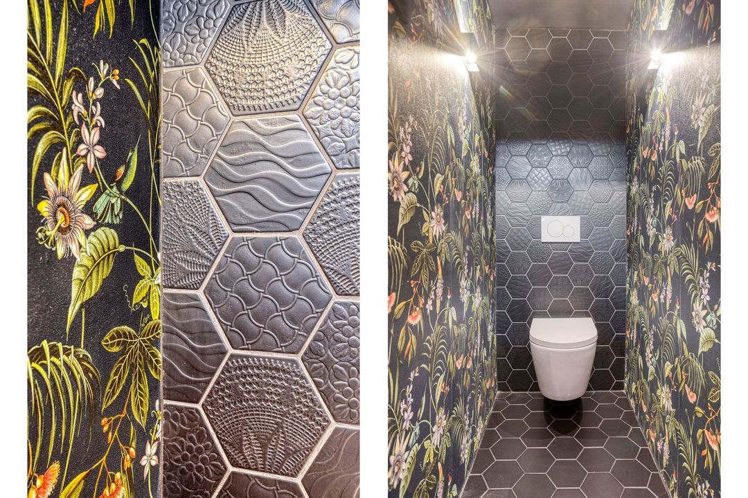 U betreedt de woning via de verzorgde entree (ca. 2 m²), voorzien van een stijlvolle donkere hexagoon patroon tegelvloer en elektrische vloerverwarming. Vanuit de entree heeft u toegang tot de meterkast, de garderobe, de toiletruimte, de woonkamer met open keuken en de garage. Het toilet is keurig betegeld en uitgerust met een modern hangcloset en eveneens voorzien van elektrische vloerverwarming.