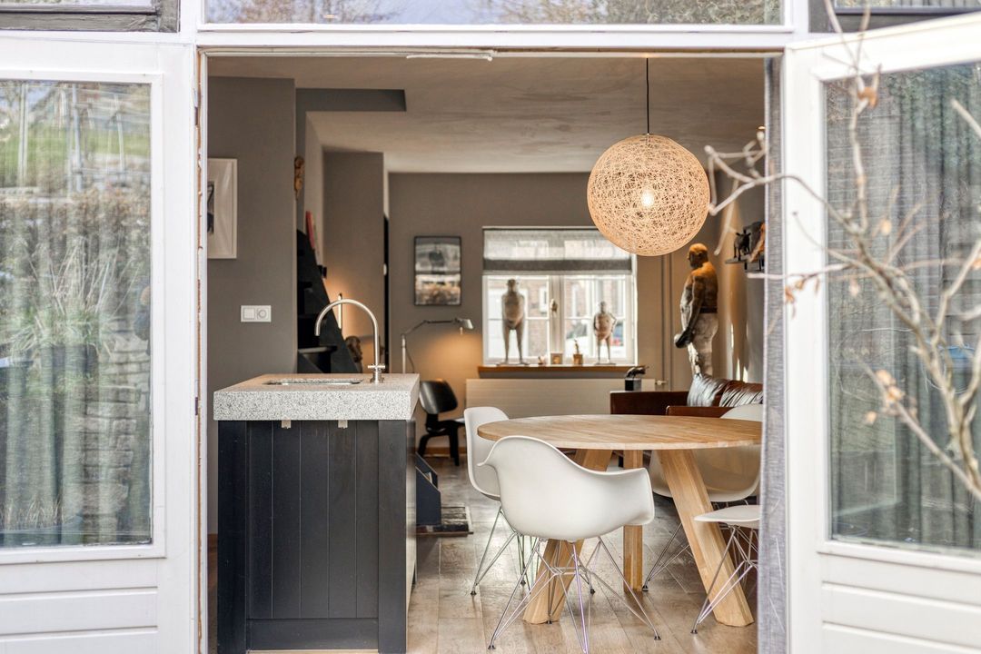 De ruime woonkamer met open keuken vormt het hart van de woning en beslaat samen circa 35 m². De houten vloer en de grote raampartijen aan zowel de voor- als achterzijde geven de leefruimte een warme uitstraling. Het vele daglicht versterkt het gevoel van ruimte en biedt tegelijkertijd een prachtig zicht op de tuin. Via de openslaande deuren aan de achterzijde bereikt u direct het terras. In de woonkamer bevindt zich tevens de trap naar de eerste verdieping
