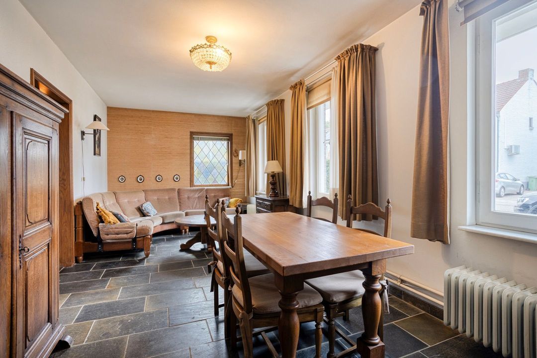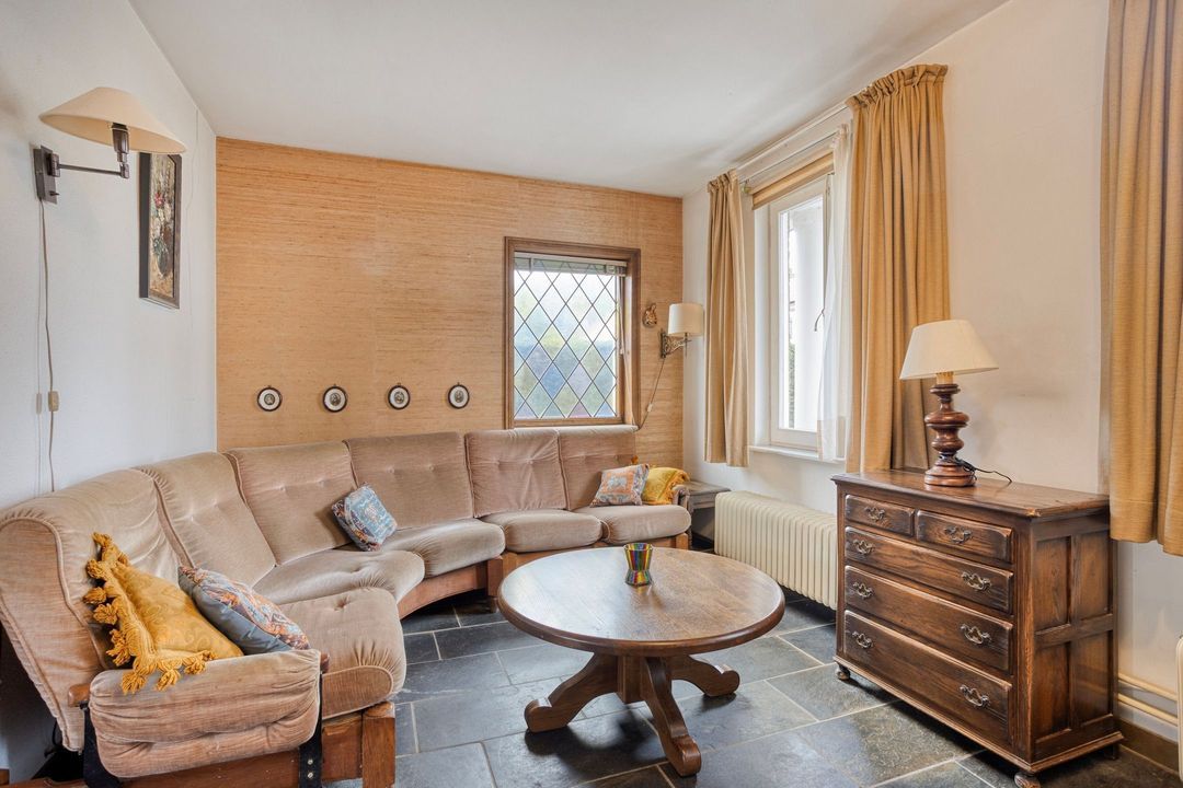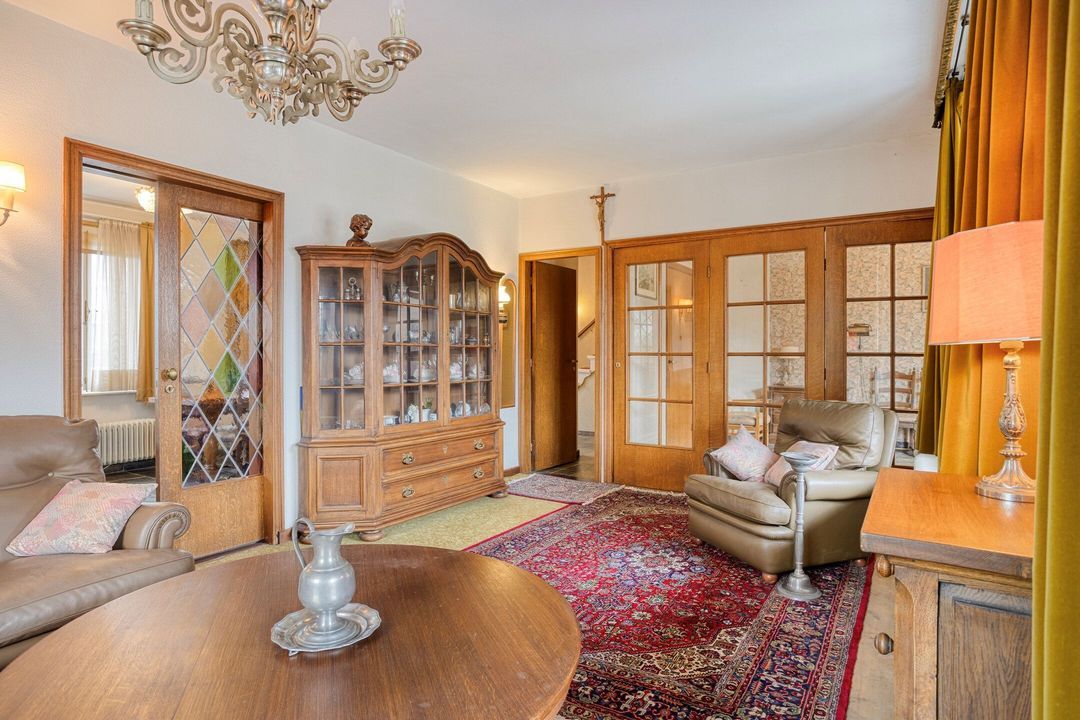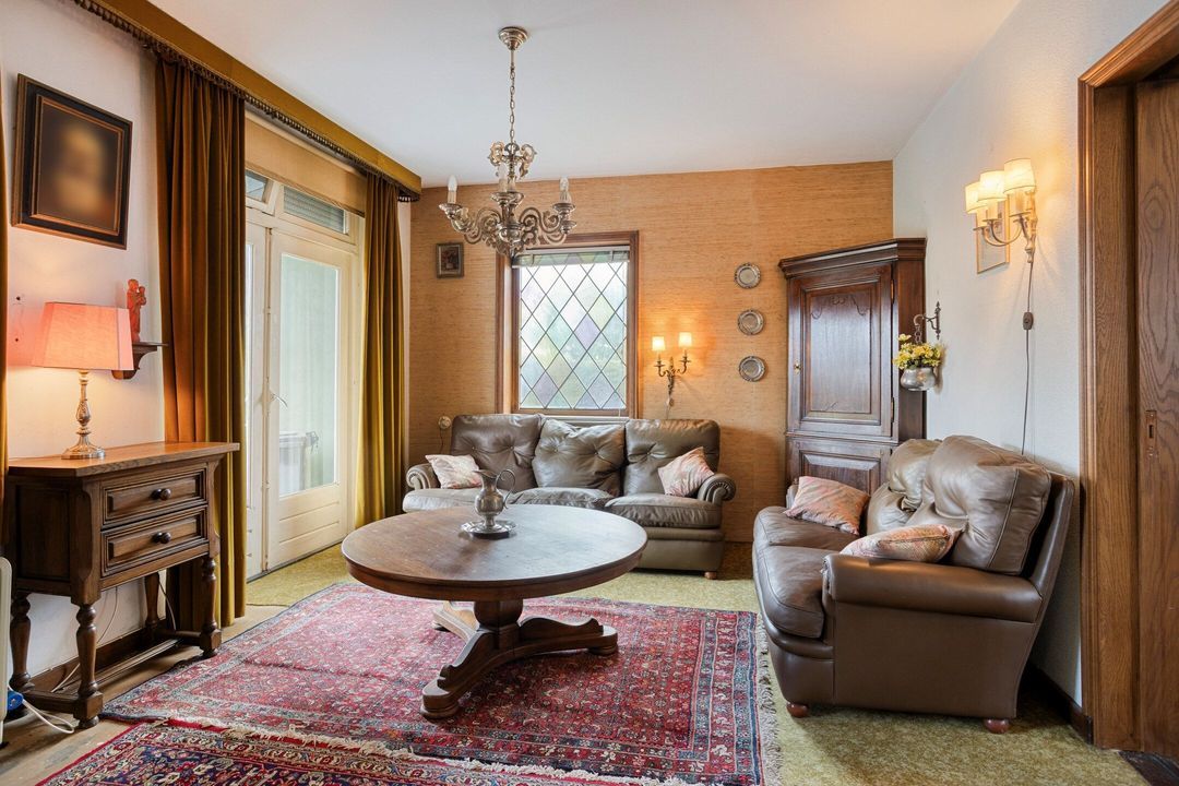 De ruime woonkamer (ca. 21 m²) ademt karakter dankzij het mooie glas-in-loodraam, de authentieke schuifdeuren en de openslaande deuren naar de tuin. De kamer biedt een fijn uitzicht op het groen en voelt bijzonder ruimtelijk aan, mede doordat de aangrenzende leefruimte volledig kan worden opengetrokken.