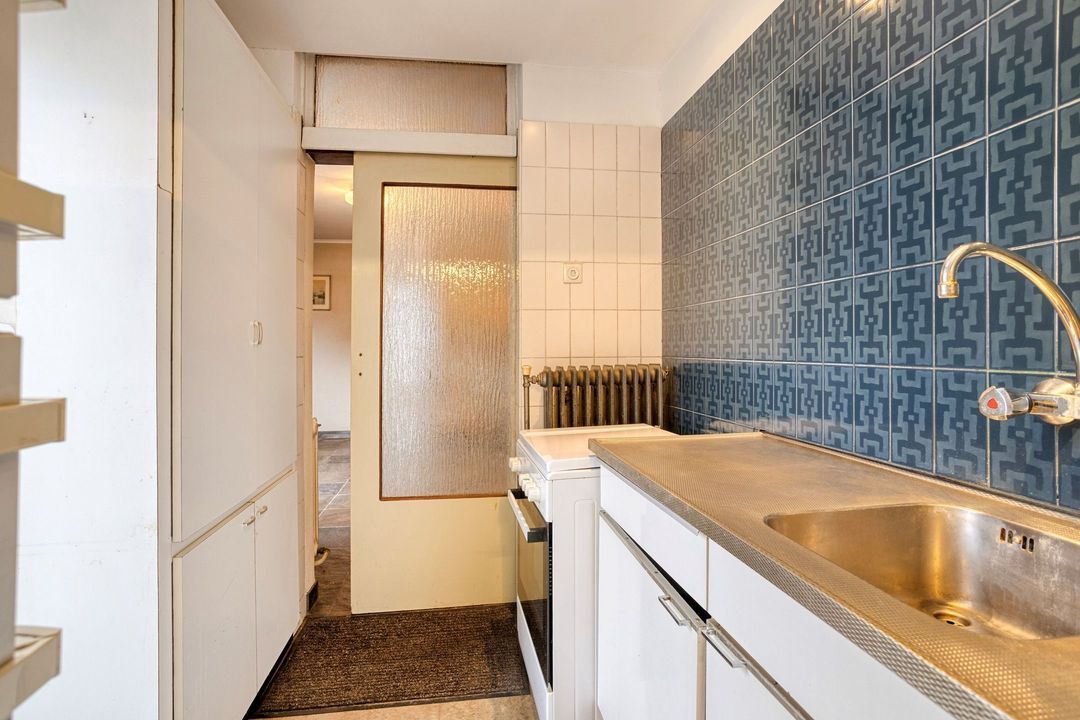 De te renoveren keuken (ca. 4,5 m²) is voorzien van een losse combi-oven, een los gasfornuis, spoelbak en volop kastruimte. Via een schuifdeur is de praktische berging van ca. 6 m² bereikbaar, ideaal voor het opbergen van proviand of huishoudelijke benodigdheden. De berging beschikt eveneens over een deur naar de tuin.