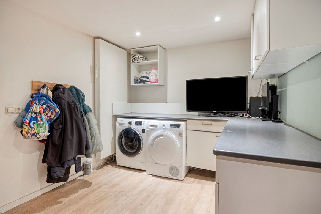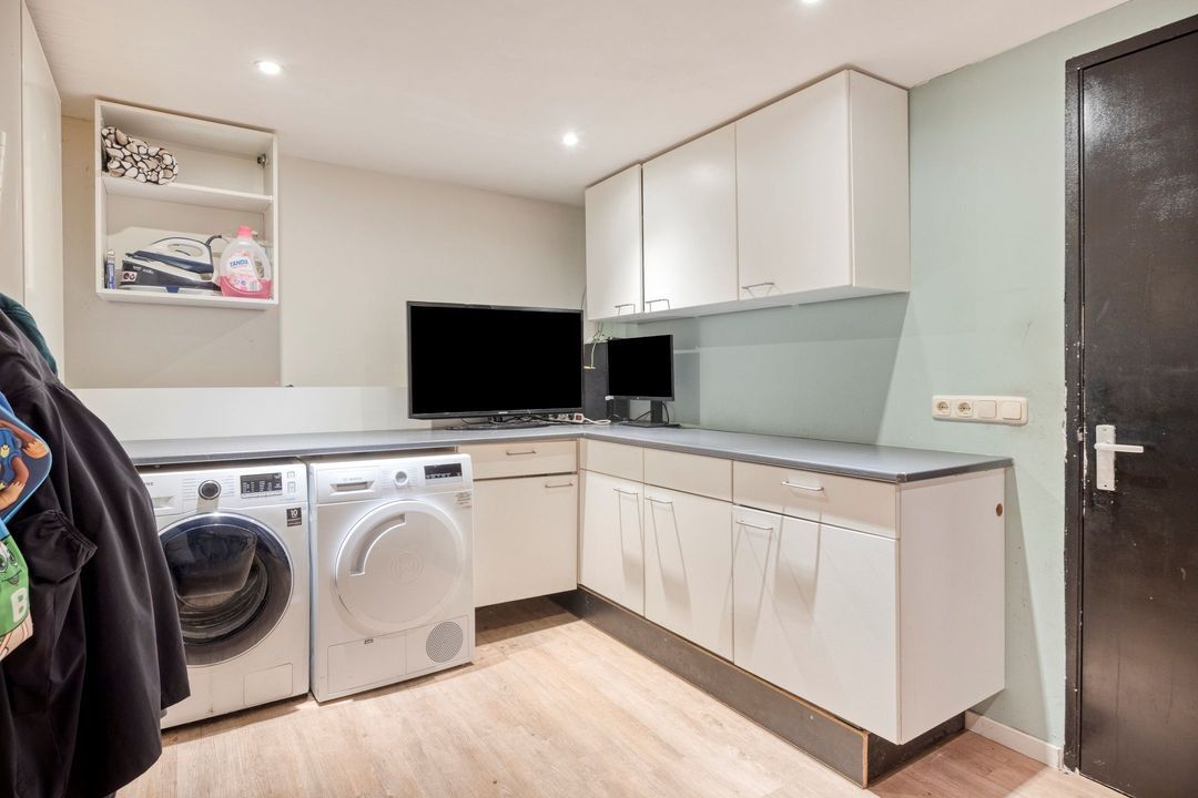 Aan de achterzijde van de leefruimte bevindt zich de deur naar de ruime bijkeuken van ca. 11,5 m². Deze is momenteel in gebruik als wasruimte en voorzien van witgoedaansluitingen en veel extra opbergruimte. Vanuit de bijkeuken heeft u eveneens directe toegang tot de tuin.
