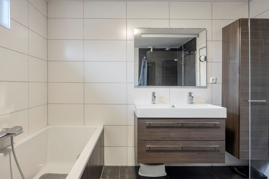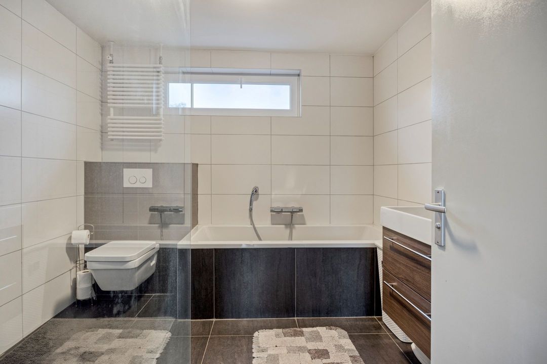 • Badkamer: De betegelde badkamer (ca. 7,5 m²) is uitgerust met een inloopdouche, een ligbad, een wastafelmeubel en een hangcloset.
